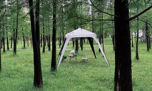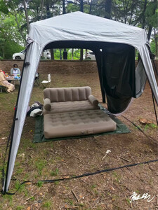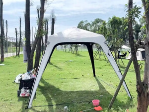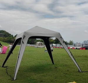 几分钟就搭好天幕。质量也非常好。性价比高。草地上搭起来就敲了四角的地钉。非常的方便,刮风也很稳的。空间大不压顶不局促。走进走出不用低头。
