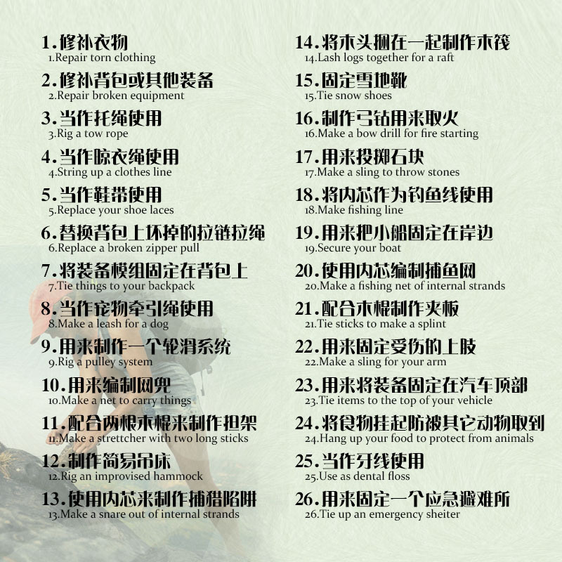 试了一下,感觉还不错,指南针比较准,口哨响亮,救援LED灯没有问题,小工具比较齐全不过实用性不是太强,野外临时用一下心里安慰,有点怕绳子散了没本事编回来啊