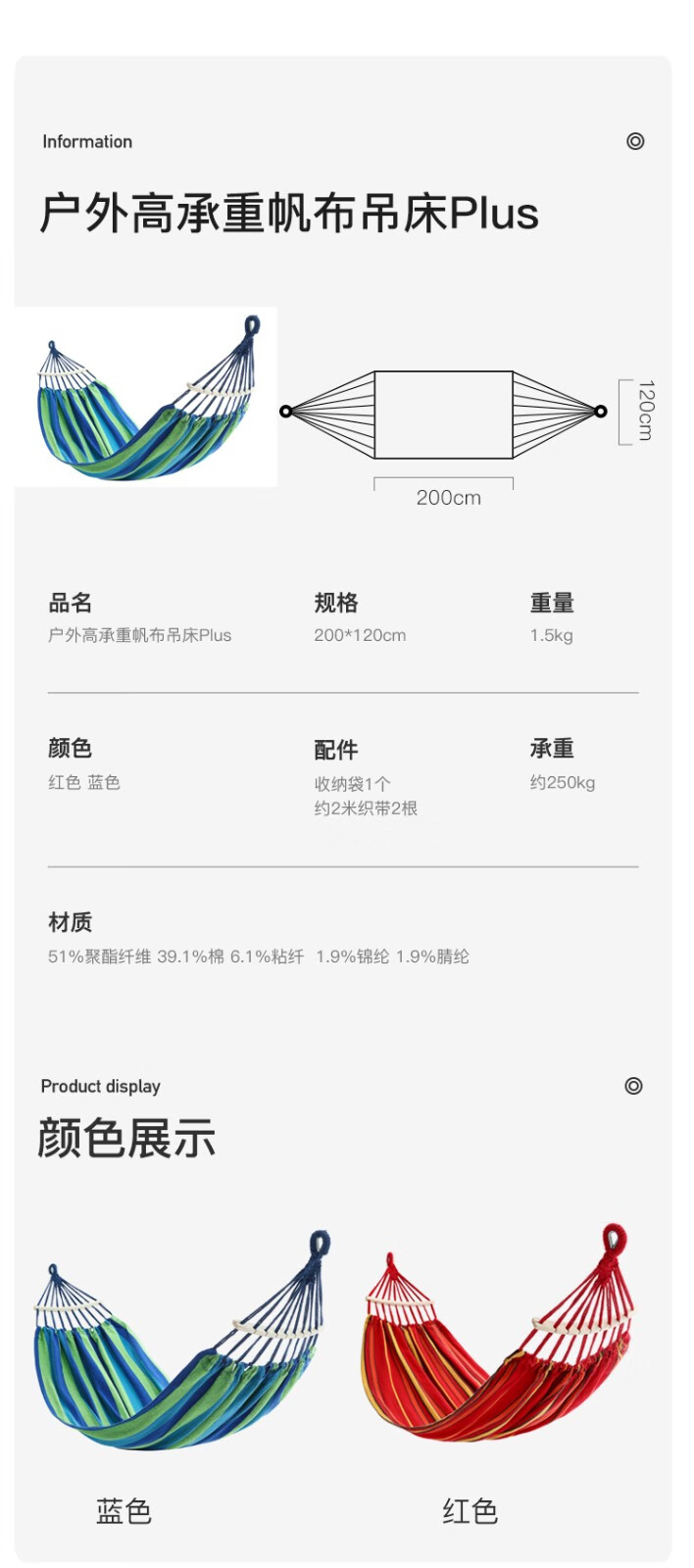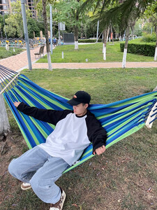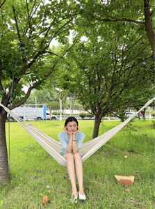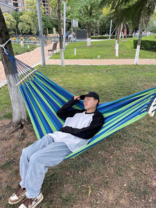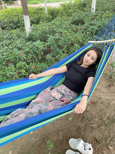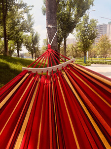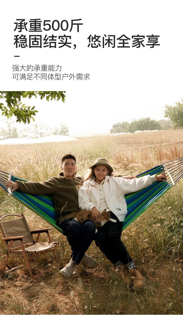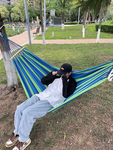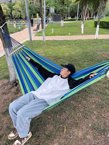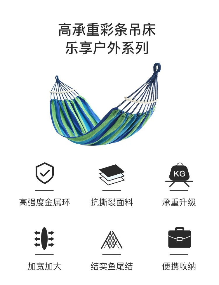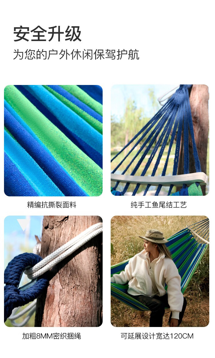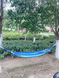 这个季节特别适合在户外活动,带着宝贝一起出去走走,搭个吊床真是特别舒服,躺在上面也非常稳当,看着很结实,颜色也鲜艳,确实不错。