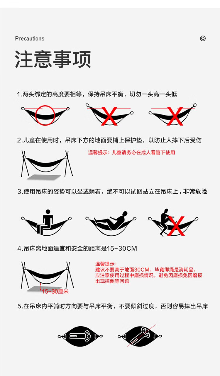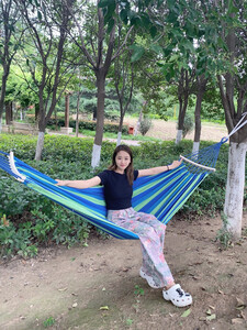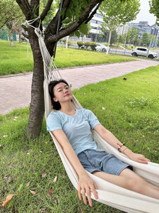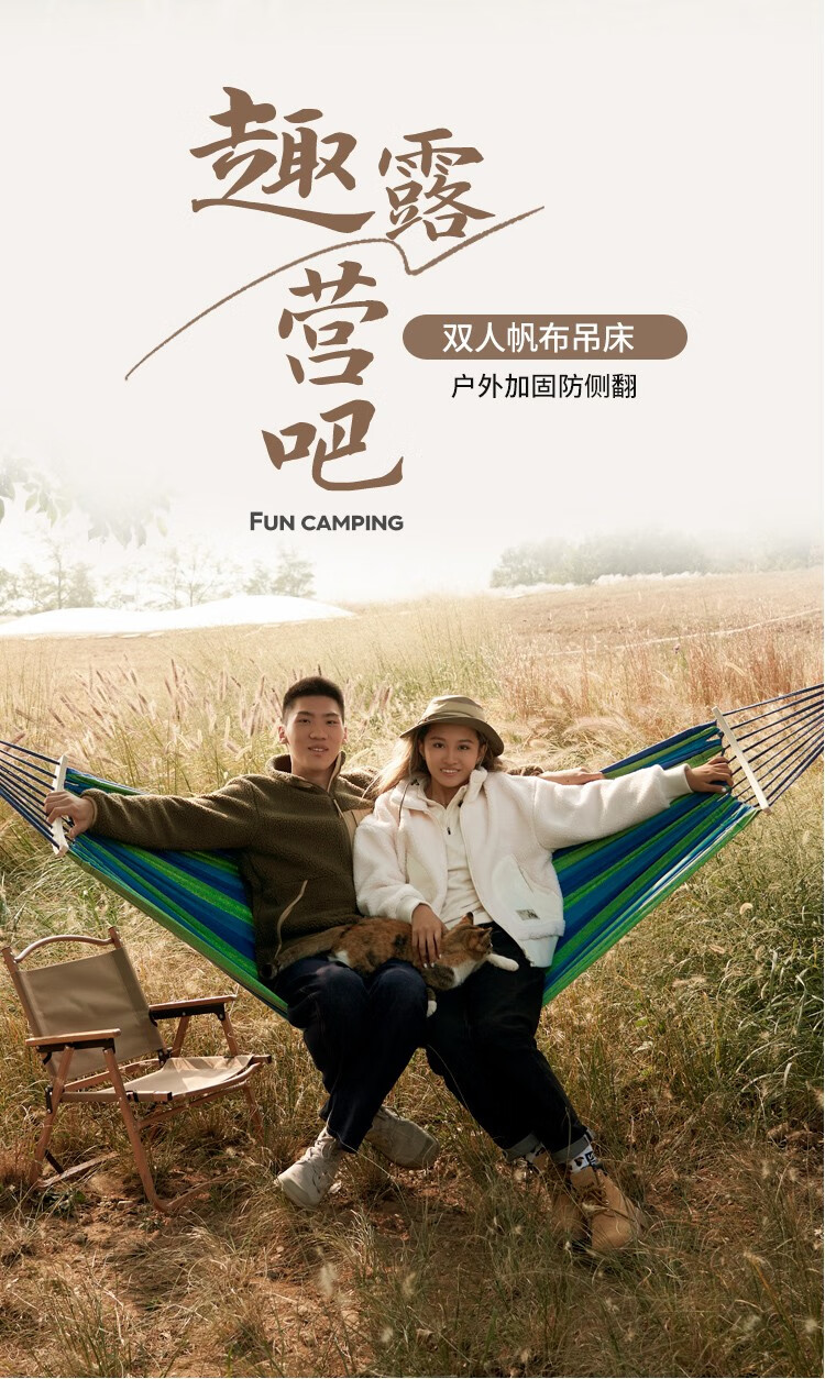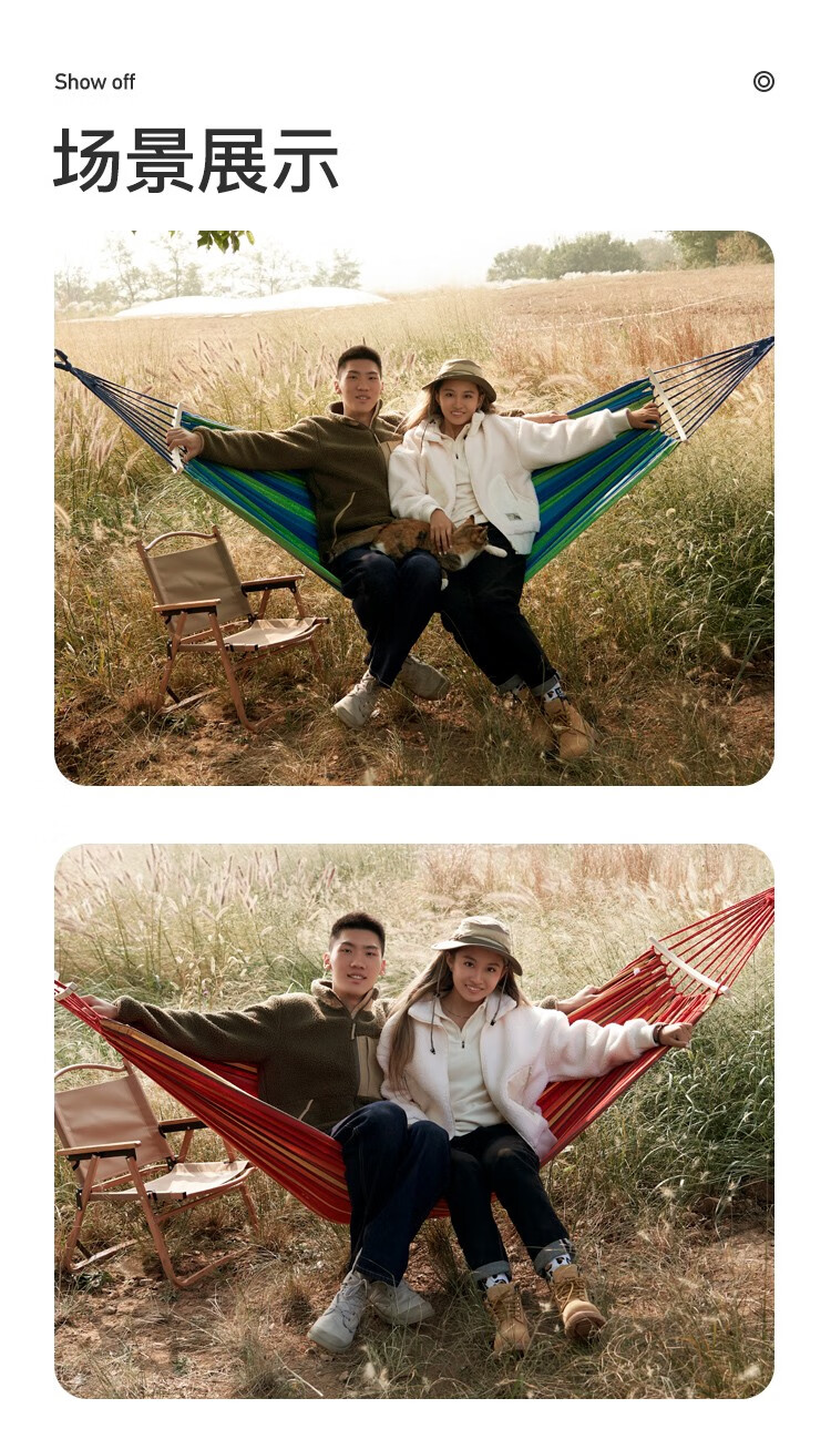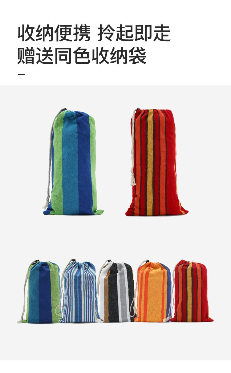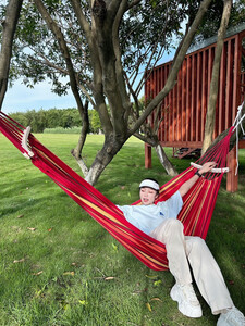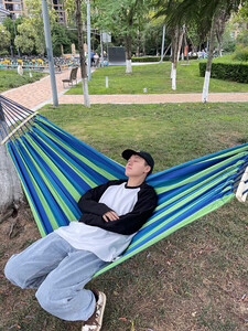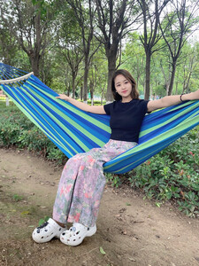 这个季节特别适合在户外活动,带着宝贝一起出去走走,搭个吊床真是特别舒服,躺在上面也非常稳当,看着很结实,颜色也鲜艳,确实不错。