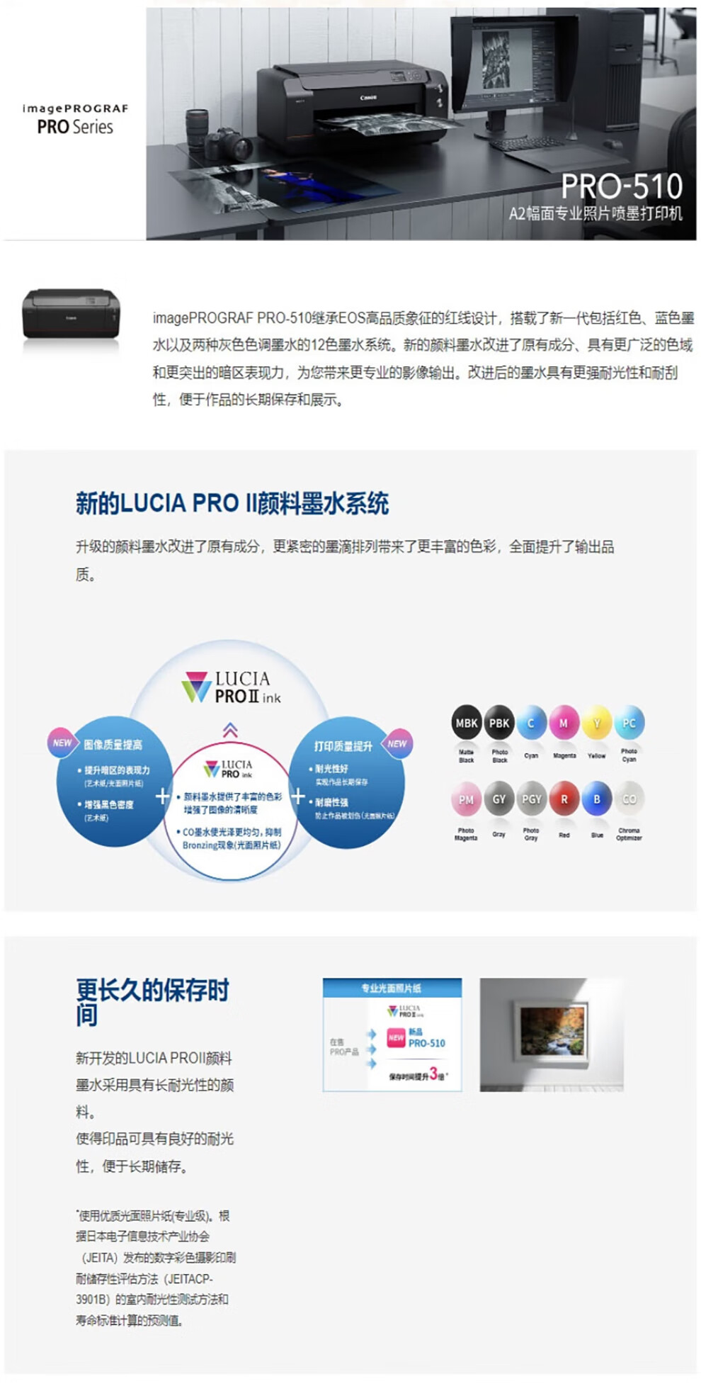 佳能(Canon)新品 PRO510A2幅面专业照片喷墨打印机 12色独立式墨水系统A3彩色打印机 官方标配