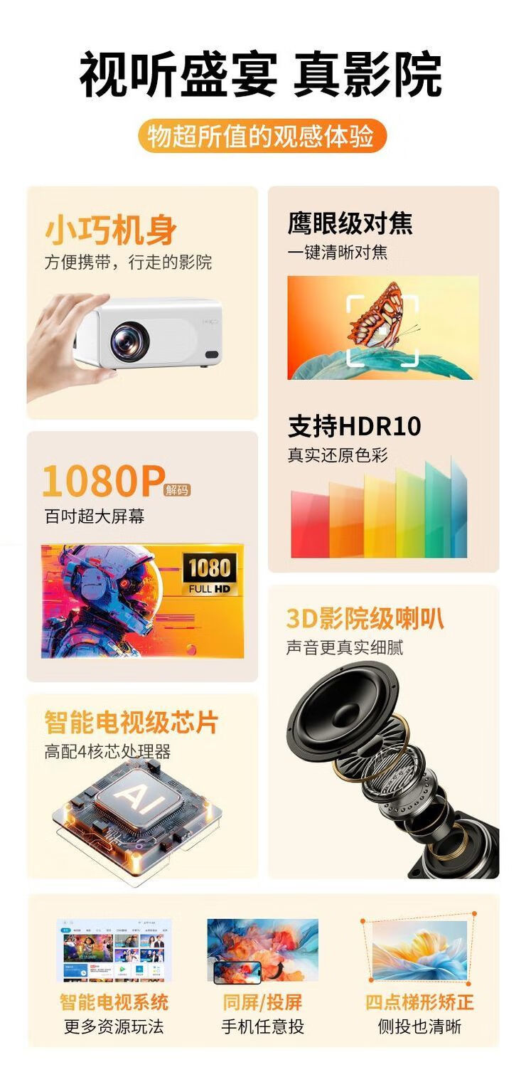 京东京造投影仪家用国家补贴放映一体机音响高清带云台支架高清投屏办公家庭影院室内外投屏器放映机I22