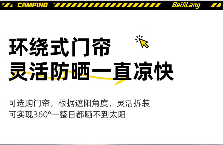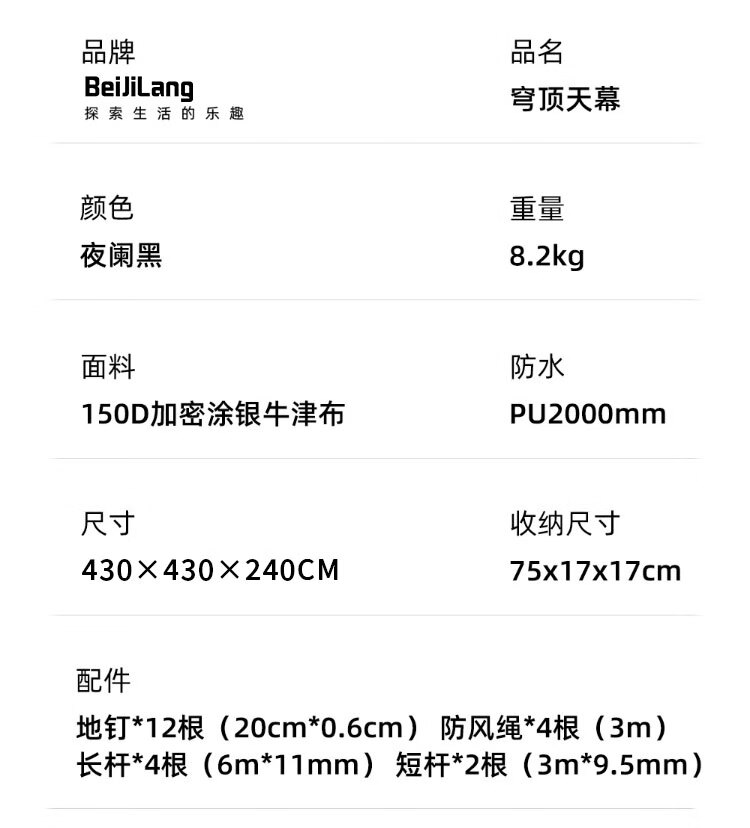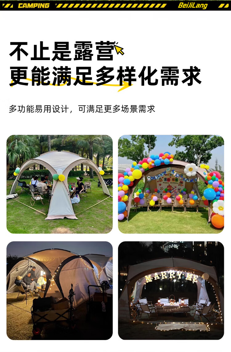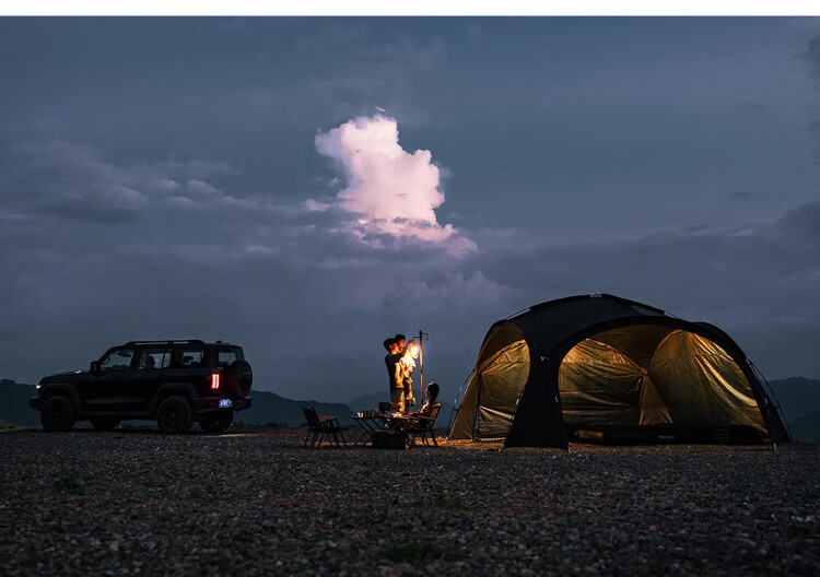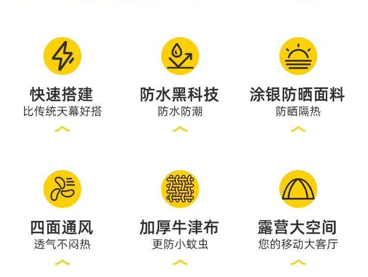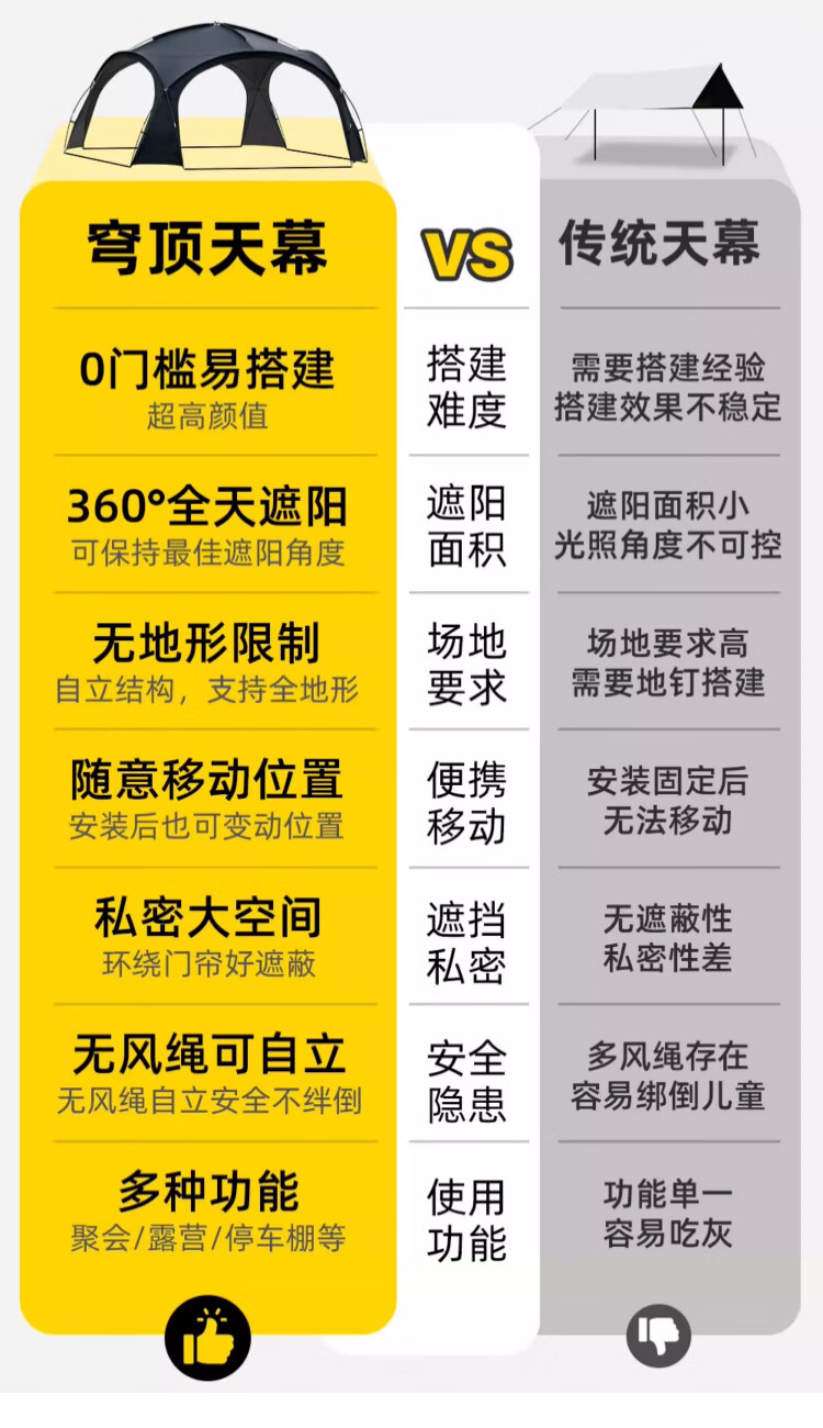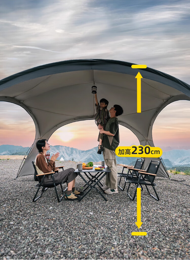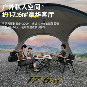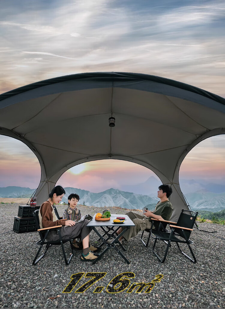 布料厚实,搭建方便,十人左右也不觉得拥挤,搭配两件遮阳帘可实现全方位无死角遮阳,适合露营携带,比天幕方便,能扛大风,值得推荐。