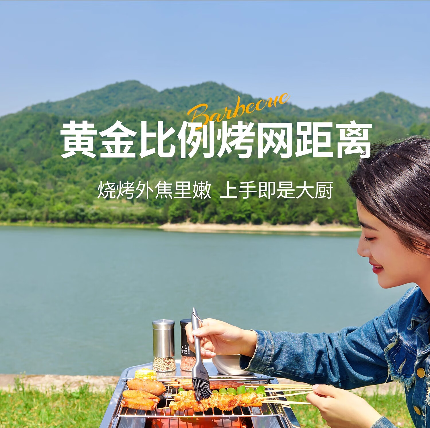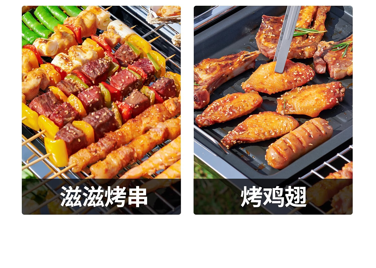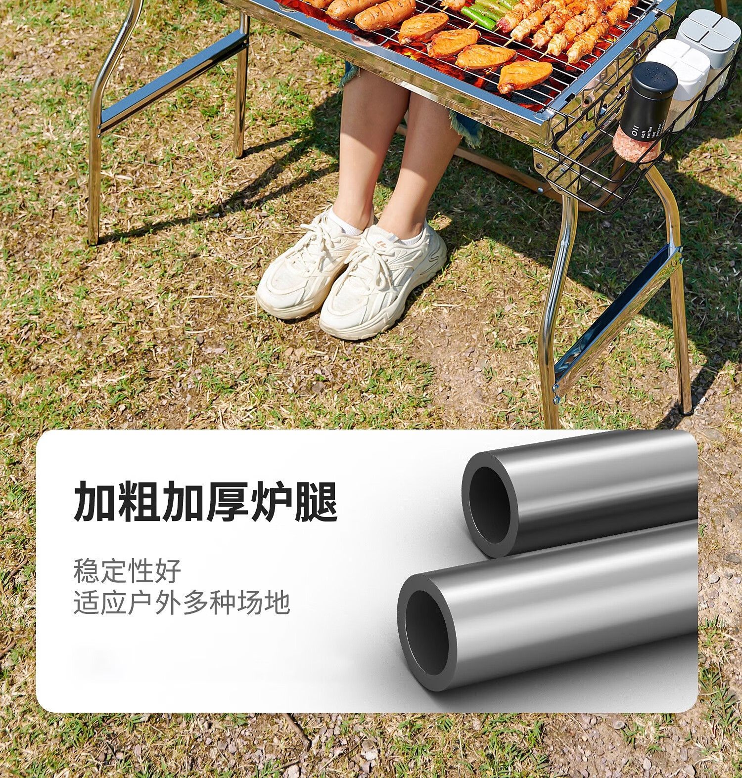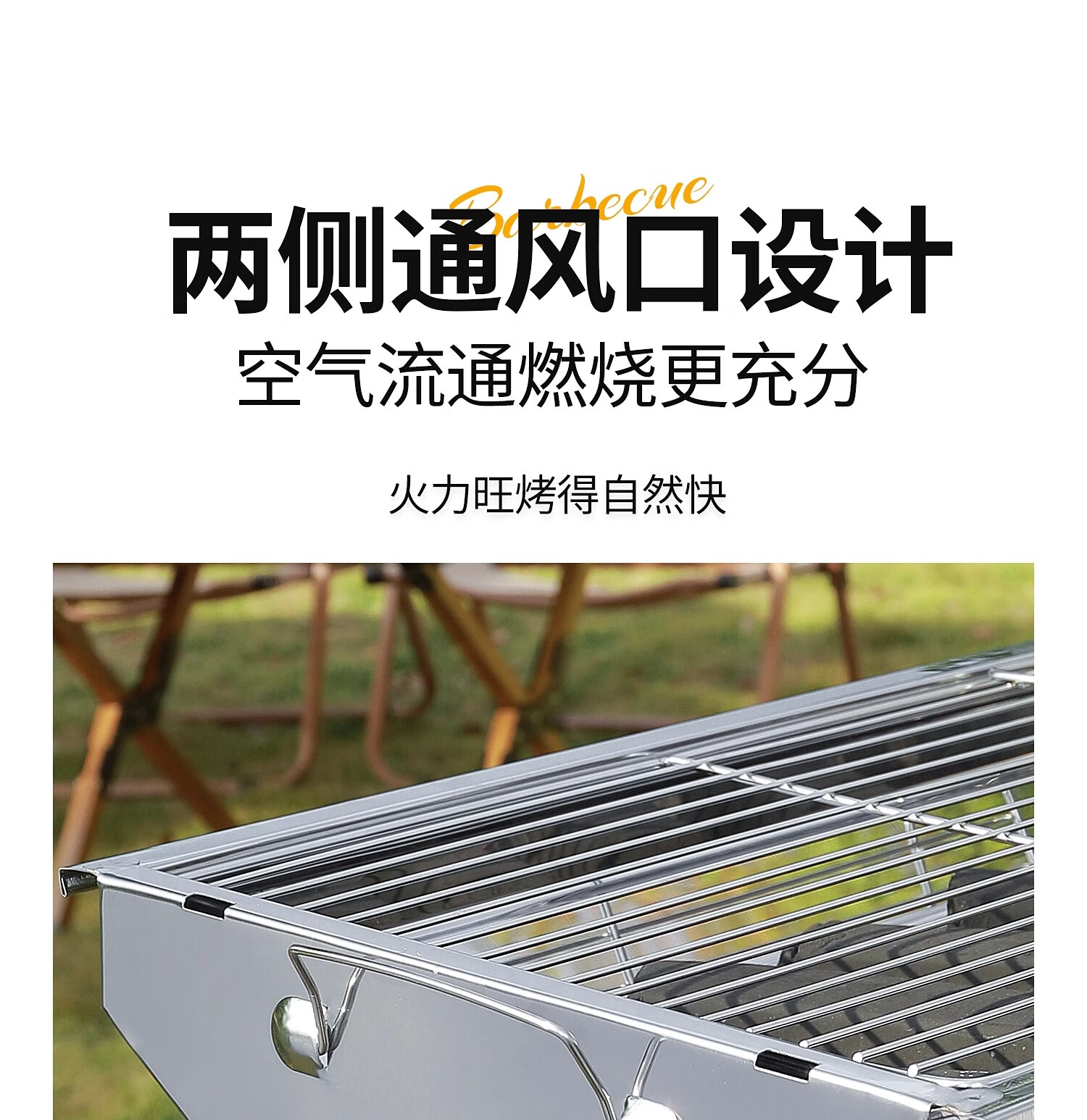 - 便携性出色:这款烧烤架的折叠设计太赞了,折叠起来后体积很小,携带方便,无论是放在汽车后备箱还是背包里都不占空间,轻松就能带到户外野餐、露营或朋友聚会的场地,真正实现了说走就走的烧烤之旅。 - 搭建与收纳简单:展开和组装非常容易,无需复杂的工具和步骤,几秒钟就能搭建好,使用完后收纳起来也很快,即使是力气较小的女生也能轻松操作,非常适合户外出行使用。 - 稳固性强:别看它折叠起来小巧轻便,展开使用时却非常稳固。加厚的炉体和精心设计的支撑结构,让烧烤架在烧烤过程中稳如磐石,即便是在风稍大的环境下也能安心烧烤,完全不用担心会晃动或倾倒。