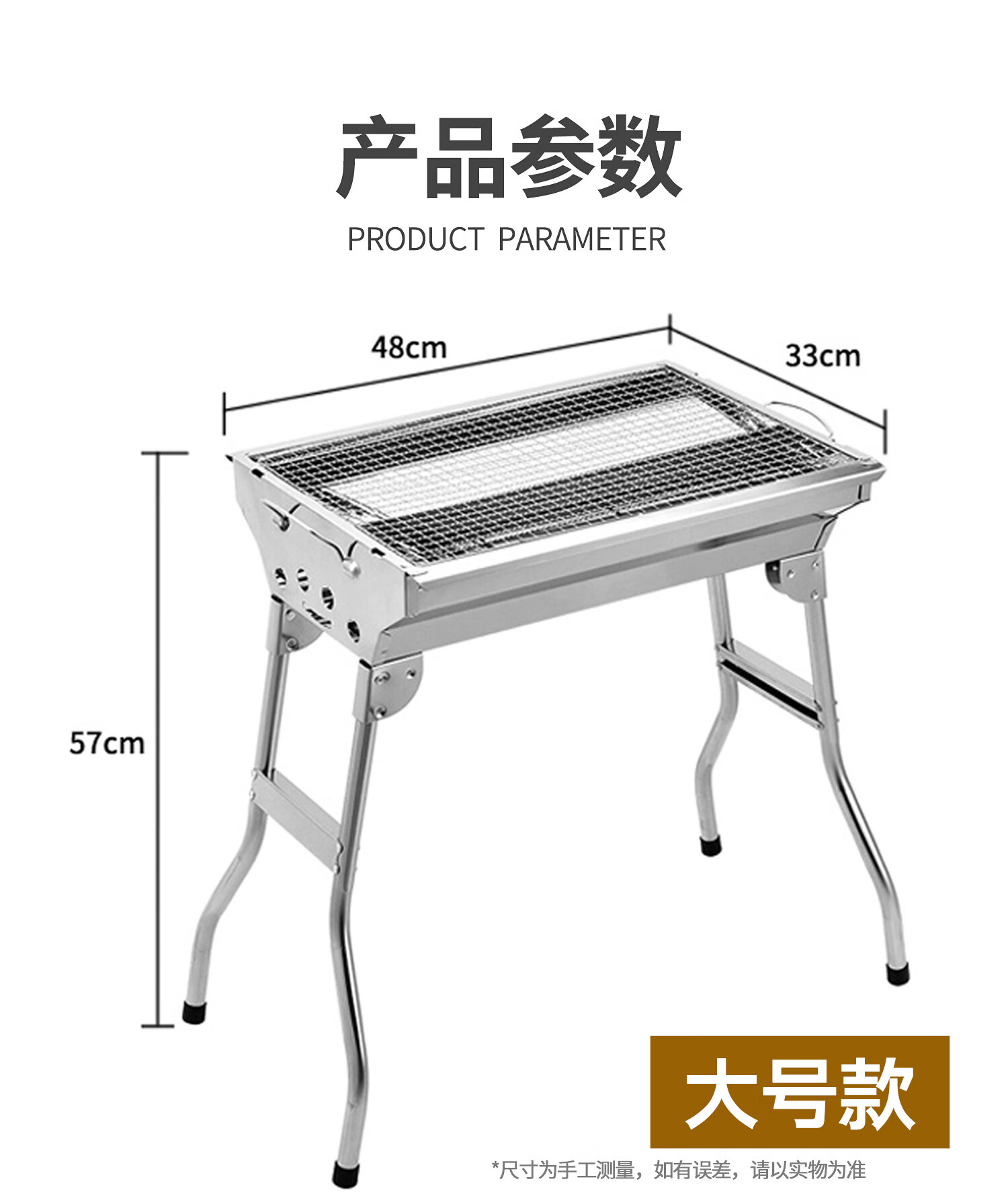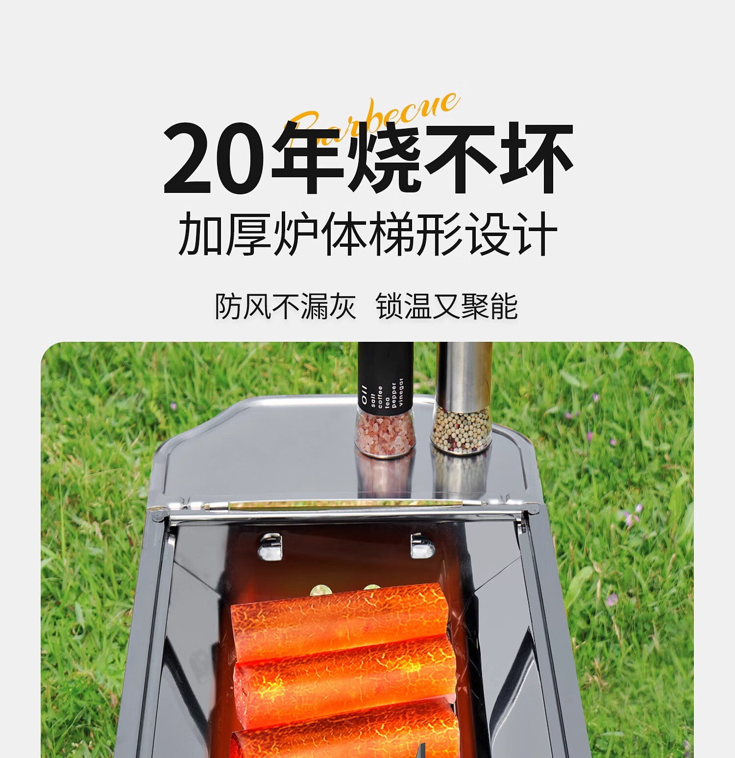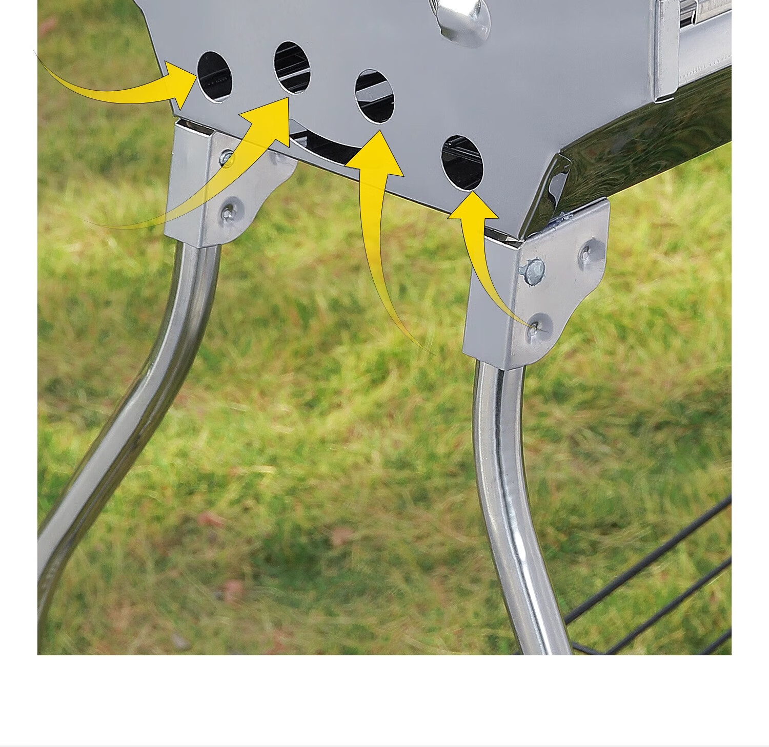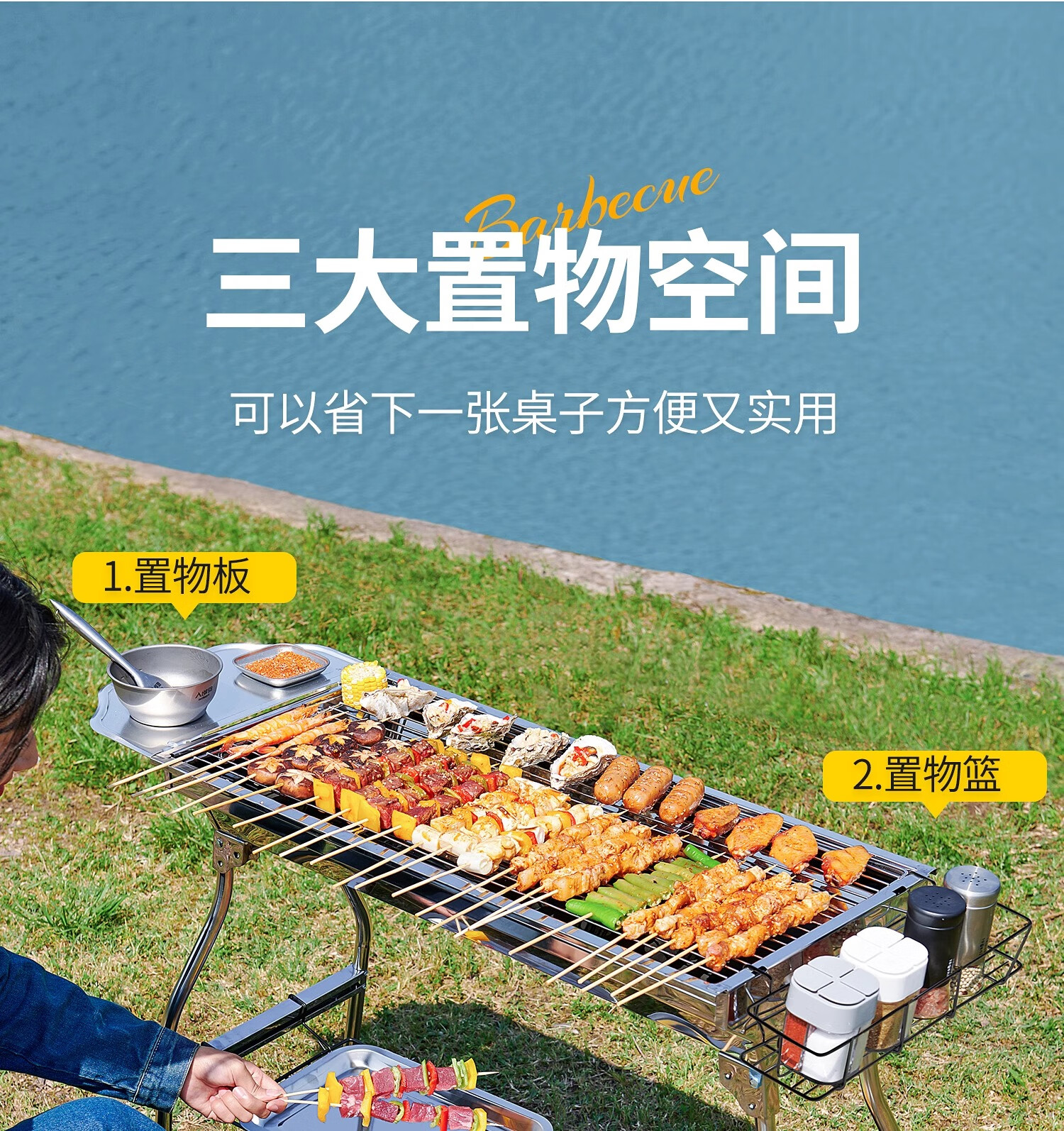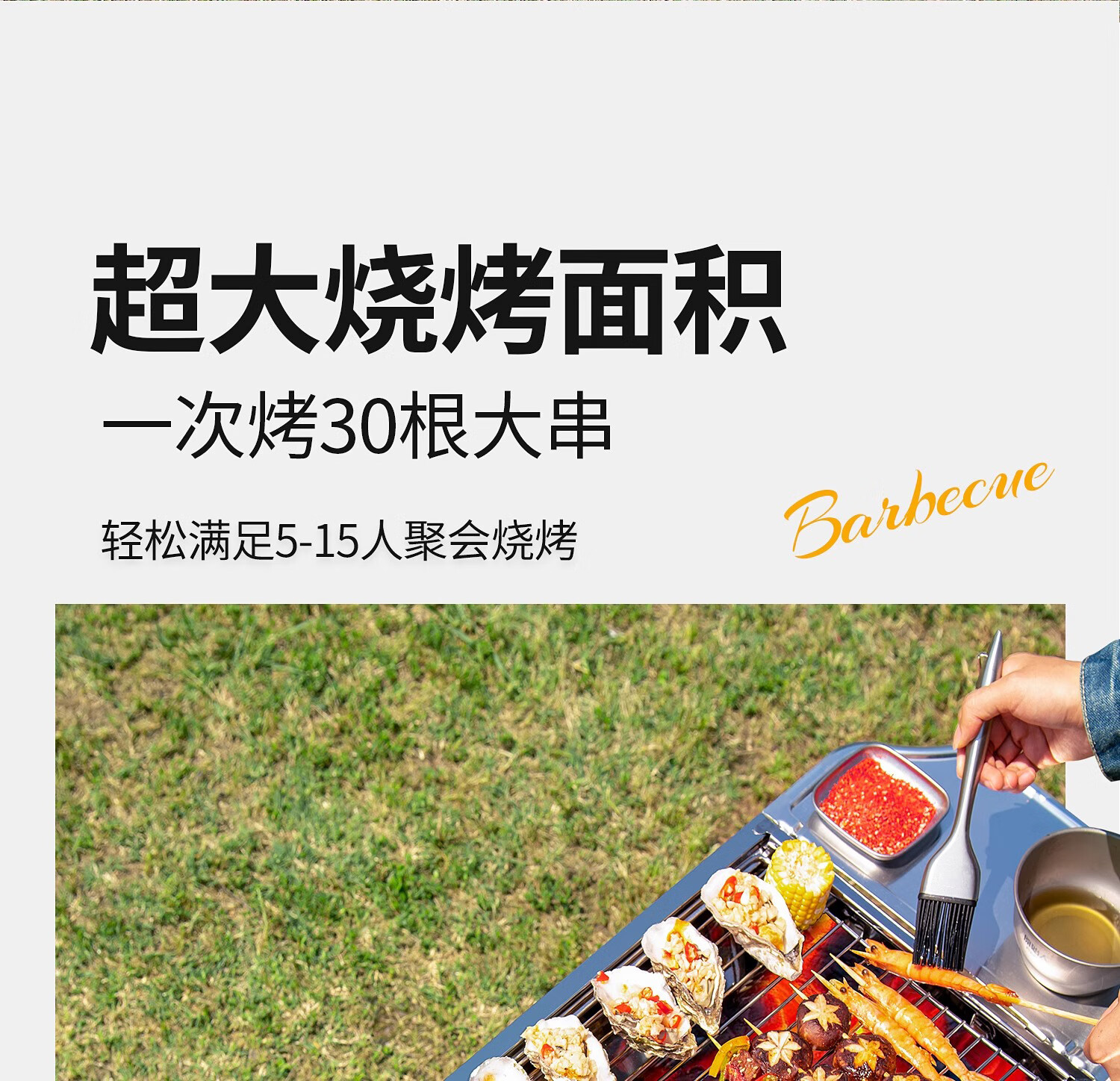 - 便携性出色:这款烧烤架的折叠设计太赞了,折叠起来后体积很小,携带方便,无论是放在汽车后备箱还是背包里都不占空间,轻松就能带到户外野餐、露营或朋友聚会的场地,真正实现了说走就走的烧烤之旅。 - 搭建与收纳简单:展开和组装非常容易,无需复杂的工具和步骤,几秒钟就能搭建好,使用完后收纳起来也很快,即使是力气较小的女生也能轻松操作,非常适合户外出行使用。 - 稳固性强:别看它折叠起来小巧轻便,展开使用时却非常稳固。加厚的炉体和精心设计的支撑结构,让烧烤架在烧烤过程中稳如磐石,即便是在风稍大的环境下也能安心烧烤,完全不用担心会晃动或倾倒。