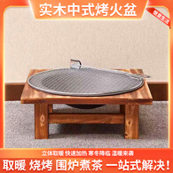 XMSJ实木老式烤火盆木炭取暖家用围炉煮茶冬季庭院户外碳火盆炭烧烤架 松木架+熟铁盆+圆网+夹子 50x50