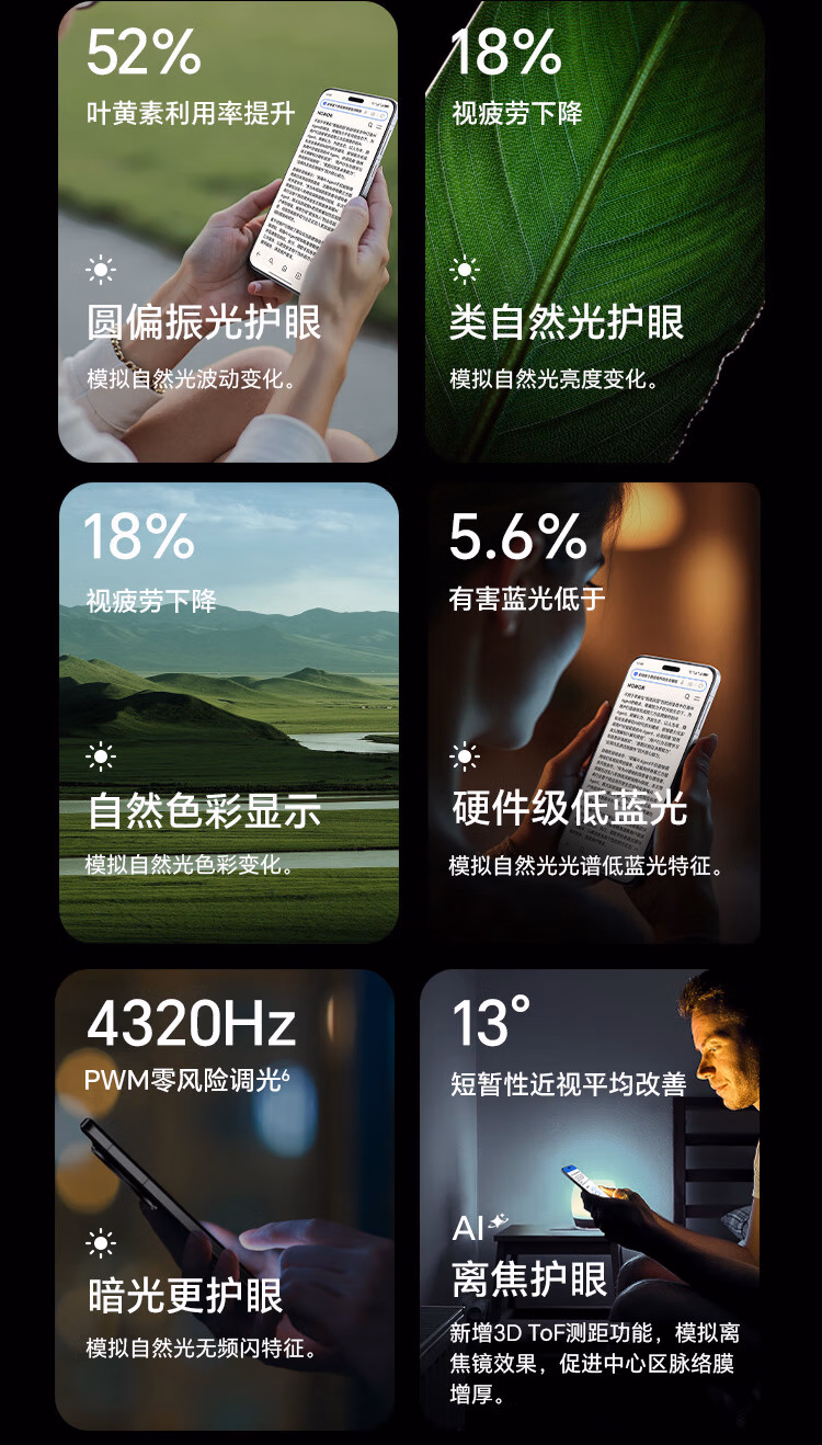 高频PWM调光;巨犀玻璃;SGS认证;德国莱茵护眼;LTPO屏幕