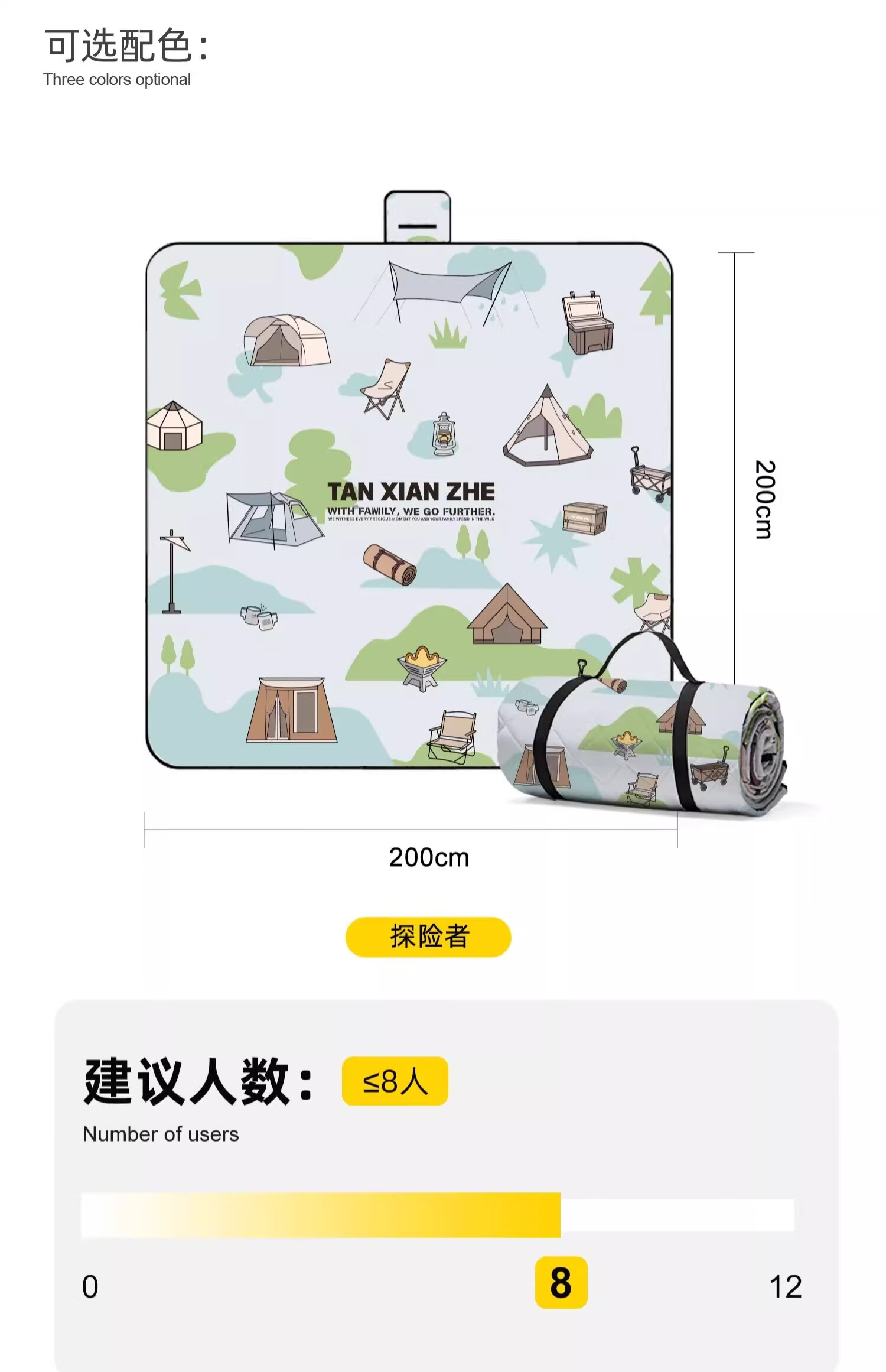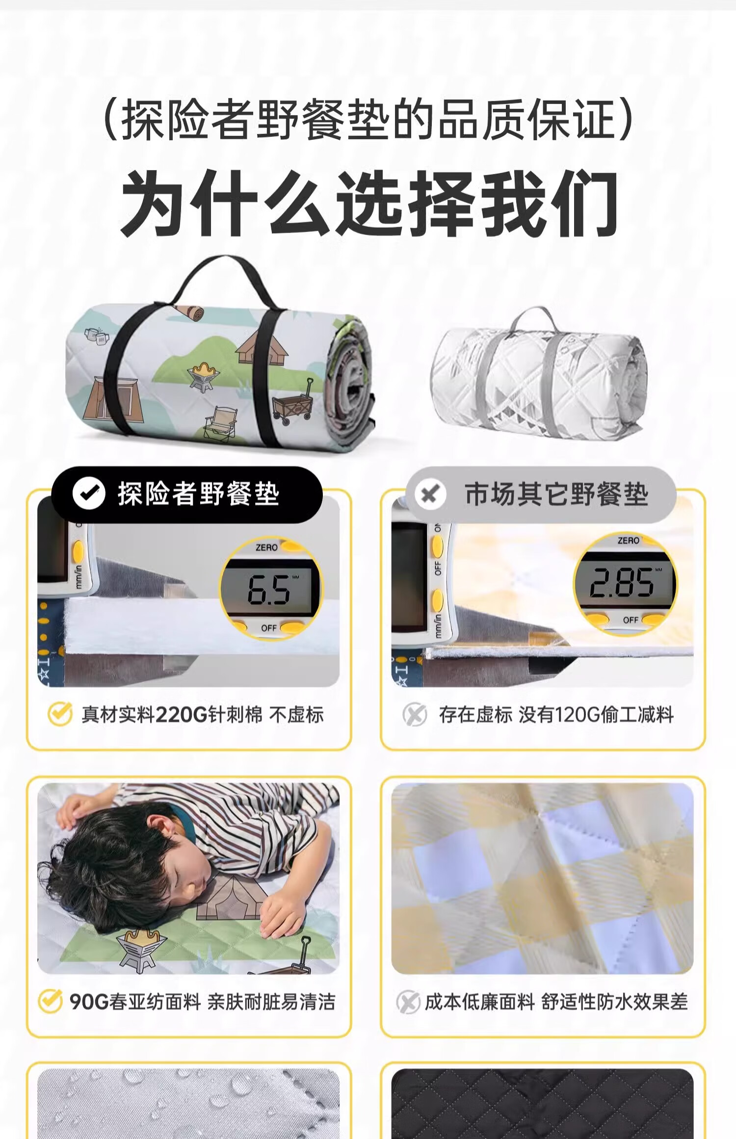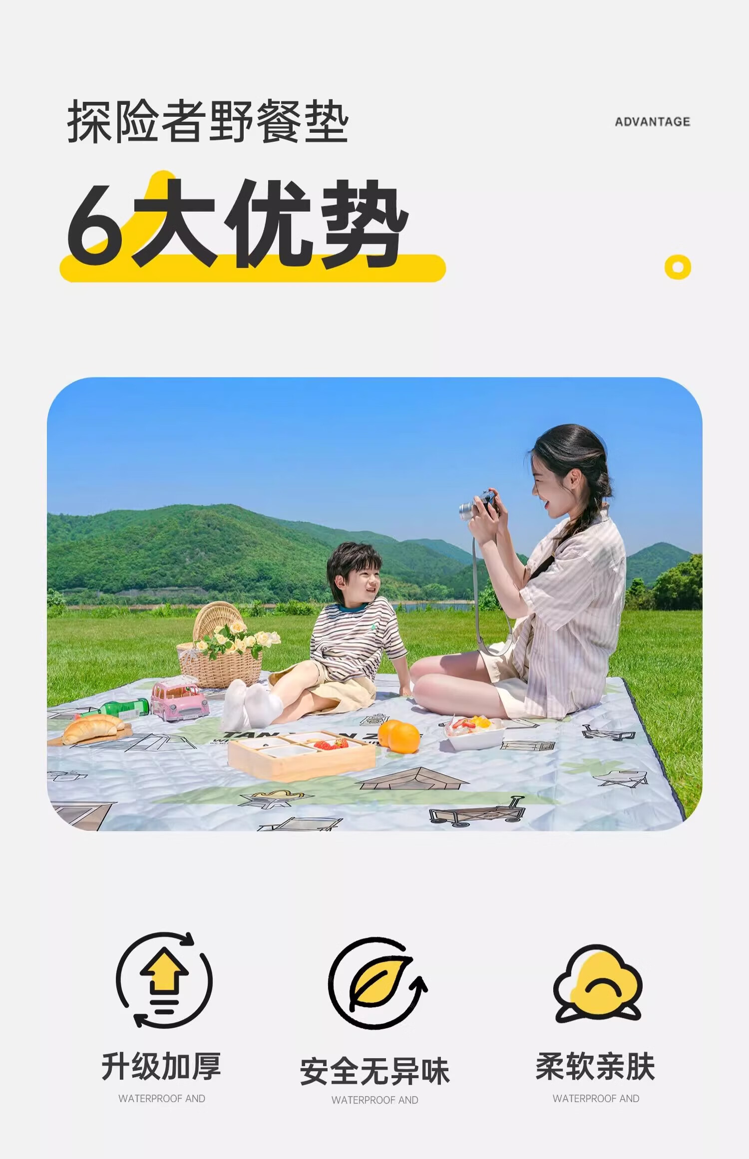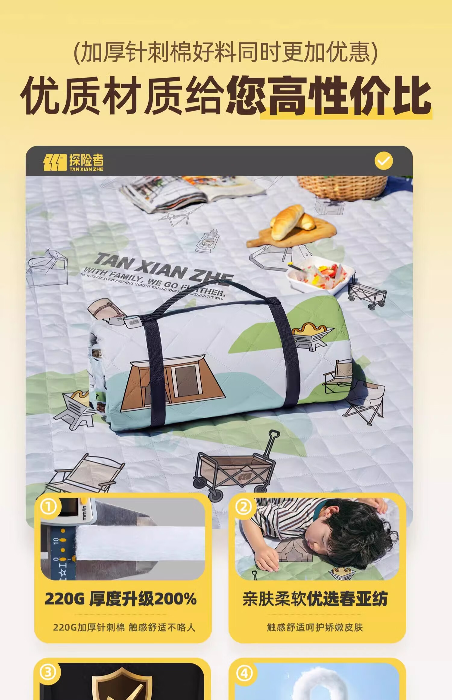 探险者这款户外野餐垫质量相当不错,防水效果好,厚度也够,铺在野地里不会膈到屁屁,收起来也不会太占地方,是现代休闲生活的必备品,给五星好评。