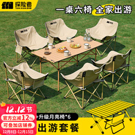 探险者户外折叠椅露营椅子月亮椅沙滩钓鱼椅野餐桌椅家用凳子 软包卡其折叠椅*6+120cm长桌(赠收纳袋)