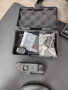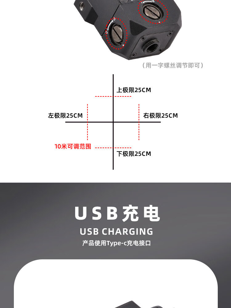 产品材质:整体尼龙材质,部分小件为金属材质,强度不错,做工很好 光照强度:比超市里卖的手电和手机的手电筒好用多了,挺亮的,还有爆闪 续航时间:比较长,连用一个小时也没什么问题 产品重量:比较轻 电源类型:用的充电线,可以边充边玩,但是别用华为的快充头 其他特色:镭指射得很远,射到街对面也没问题,晚上还能看到线。带的鼠尾操作和按钮一样,造型也很帅。唯一的缺点就是不太防水,可以把上面的小孔堵一下