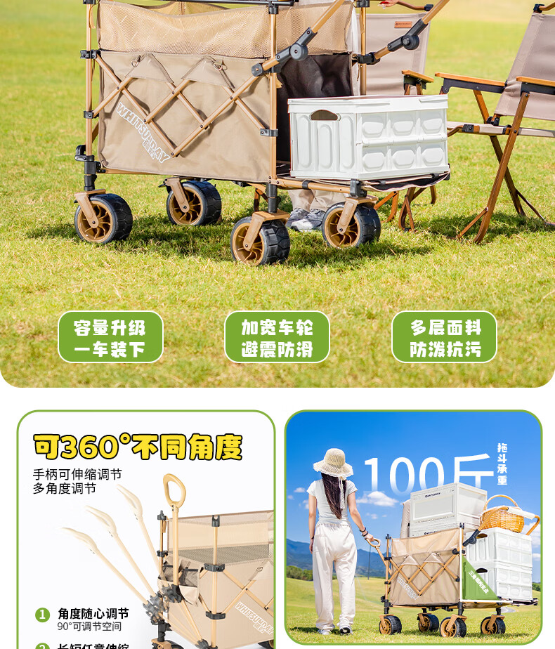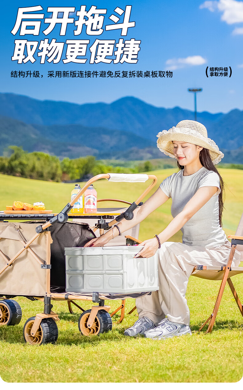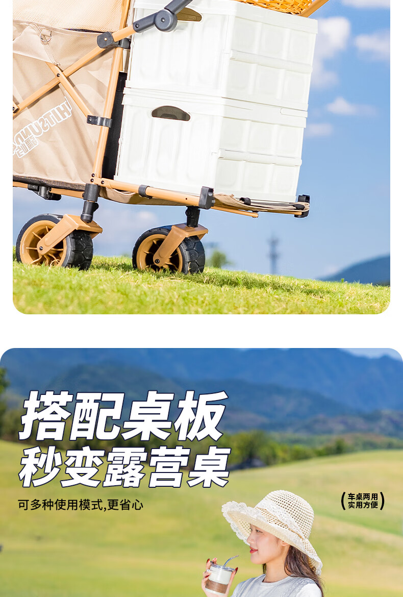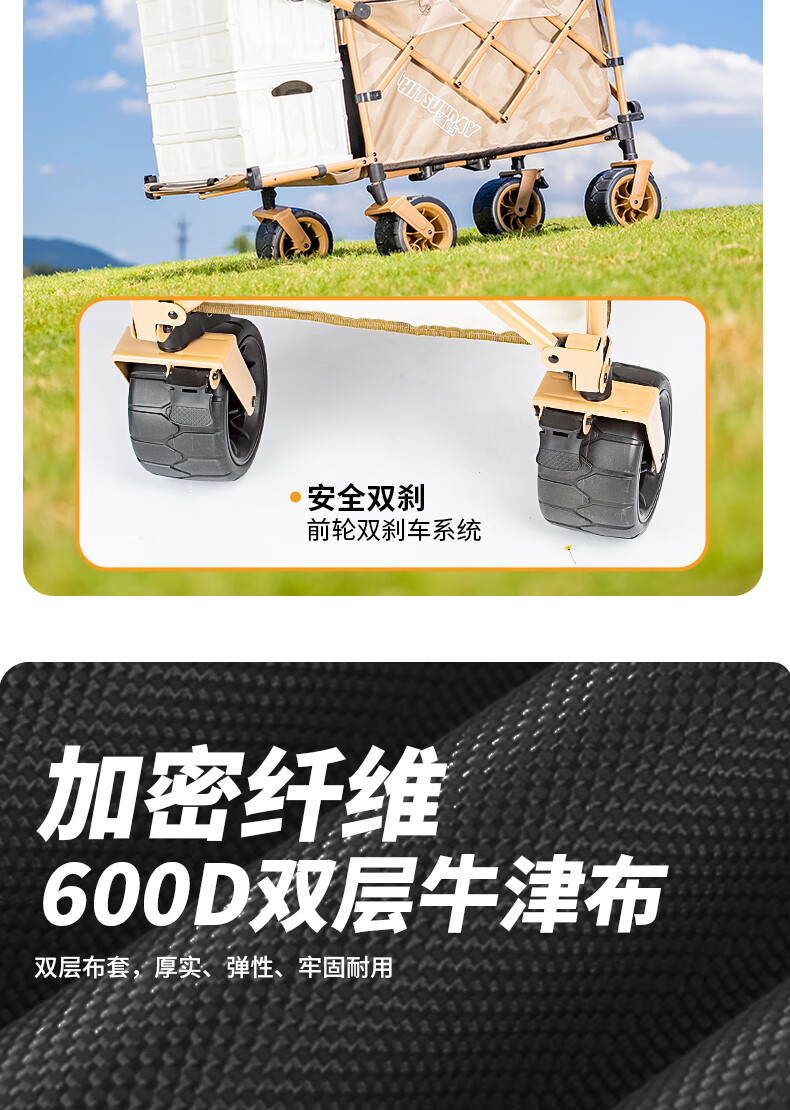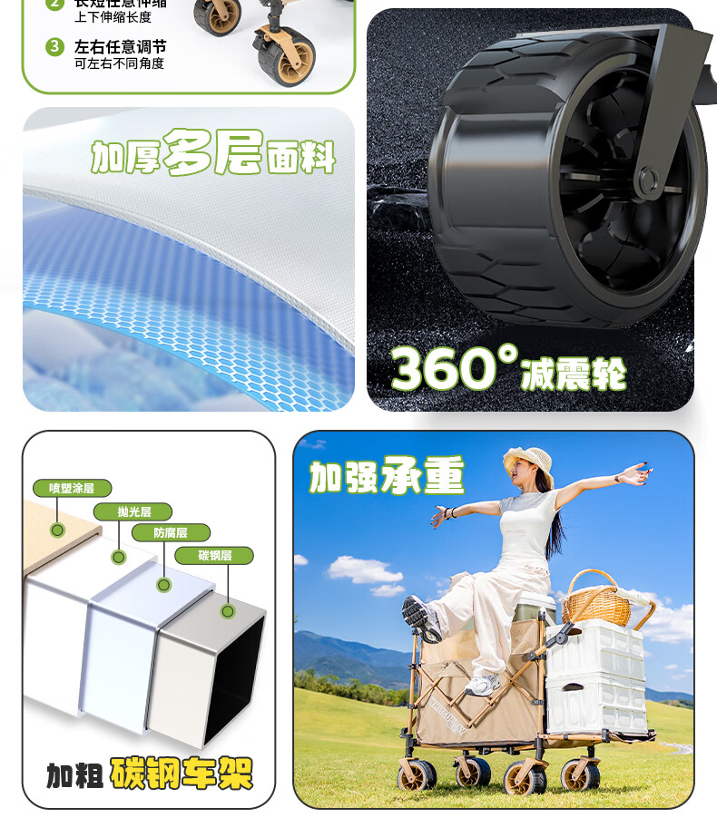 1. 材质与耐用:车架碳钢+抗撕裂牛津布,结实抗造。喷塑工艺防刮防锈,复杂户外环境也耐用,承重强,轻松应对露营装备搬运 。 2. 折叠便携:两向折叠超方便,一提就收拢,不占空间,放车后备箱或家里都轻松,单人/小家庭出游适配。 3. 灵活好推:万向车轮360°转向,崎岖山路、沙滩等地形都能驾驭,手柄可按身高调高度角度,推拉省力,长时间用也不易累。 4. 容量实用:大容量能装,70L车身堆载达140L ,帐篷、睡袋等露营物,日常购物、取快递、搬小物件都能行,一车多用。 5. 细节贴心:手柄人体工学设计,握感好还带固定扣;静音轮胎不扰人;部分款有隐藏遮阳棚,太阳大时能给娃遮阳 。 6. 性价比高:百元价位(日常一百出头 ),功能、质量能打,对露营新手或注重实用的人,是高性价比之选。 像 “车架结实抗造,牛津布耐扯,喷塑防锈,用好久没磨损,装一堆装备稳稳的”“折叠太方便!不占空间,出门放后备箱,露营、买菜、取快递全能干,性价比绝了” 这类真实体验,能让好评更生动~