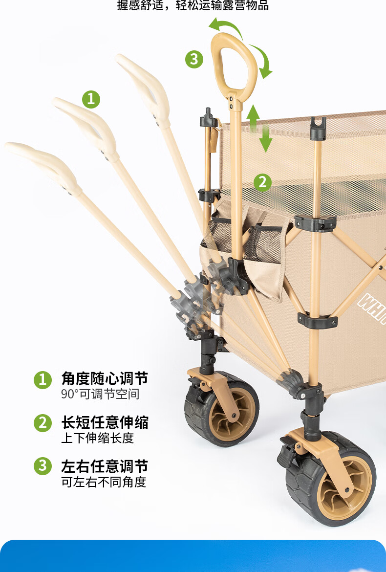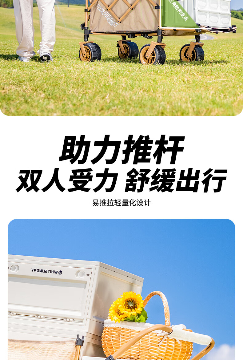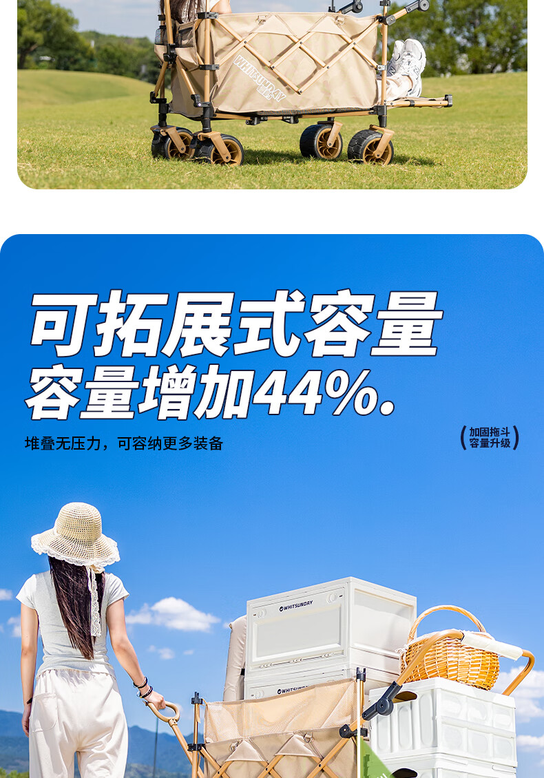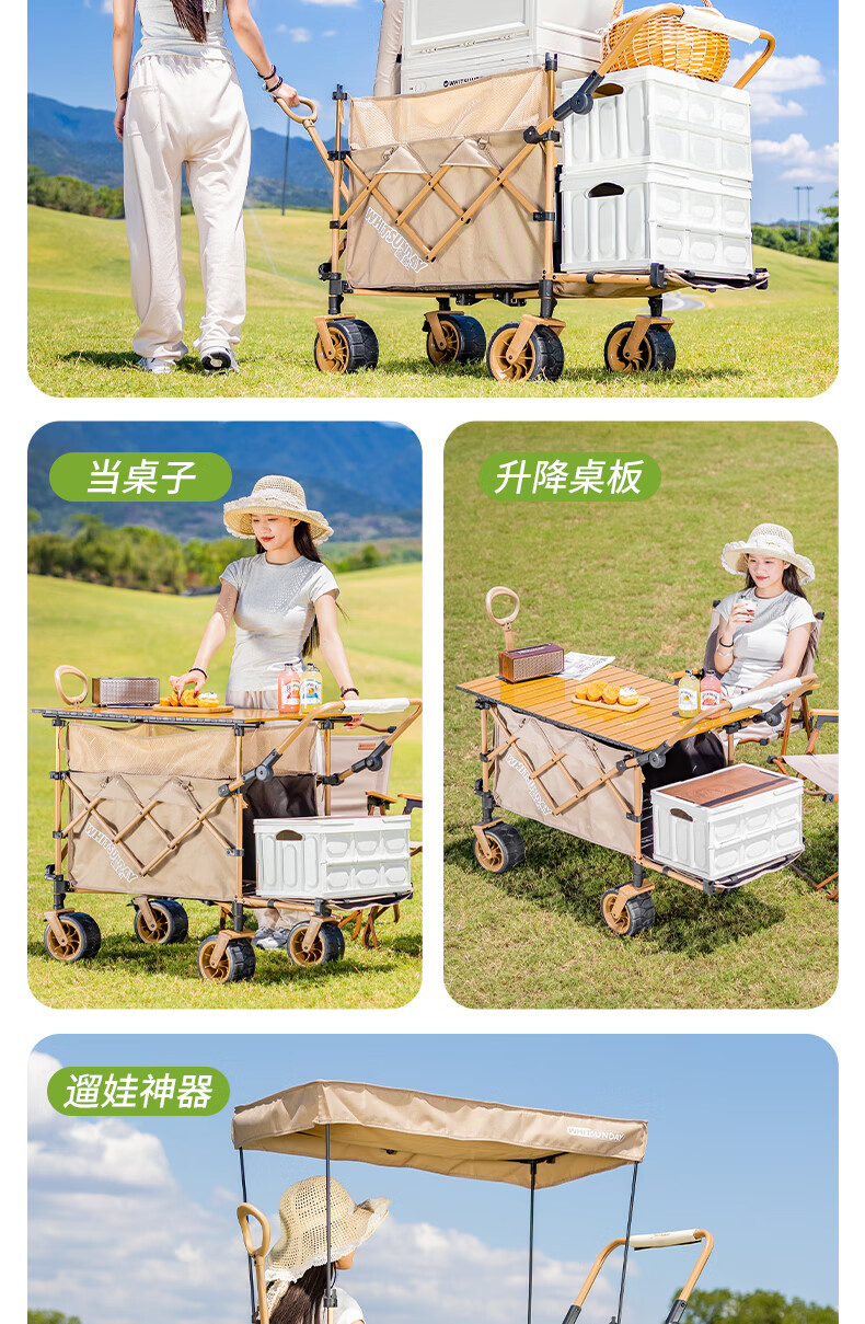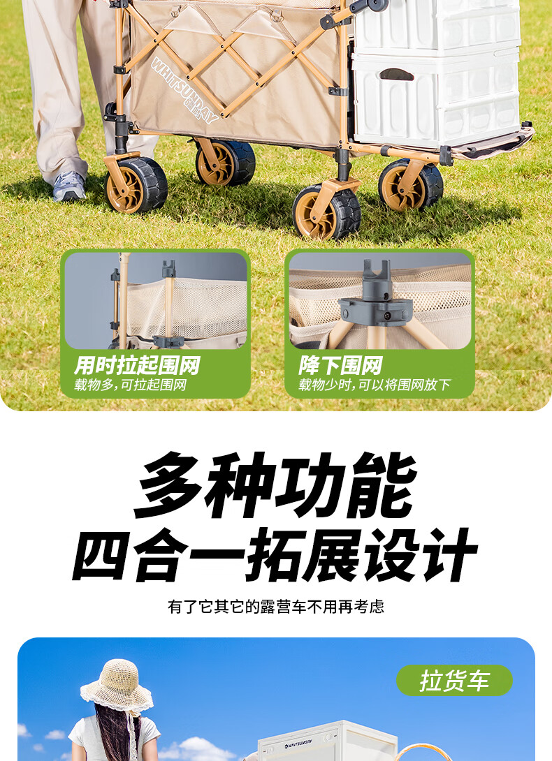 1. 材质与耐用:车架碳钢+抗撕裂牛津布,结实抗造。喷塑工艺防刮防锈,复杂户外环境也耐用,承重强,轻松应对露营装备搬运 。 2. 折叠便携:两向折叠超方便,一提就收拢,不占空间,放车后备箱或家里都轻松,单人/小家庭出游适配。 3. 灵活好推:万向车轮360°转向,崎岖山路、沙滩等地形都能驾驭,手柄可按身高调高度角度,推拉省力,长时间用也不易累。 4. 容量实用:大容量能装,70L车身堆载达140L ,帐篷、睡袋等露营物,日常购物、取快递、搬小物件都能行,一车多用。 5. 细节贴心:手柄人体工学设计,握感好还带固定扣;静音轮胎不扰人;部分款有隐藏遮阳棚,太阳大时能给娃遮阳 。 6. 性价比高:百元价位(日常一百出头 ),功能、质量能打,对露营新手或注重实用的人,是高性价比之选。 像 “车架结实抗造,牛津布耐扯,喷塑防锈,用好久没磨损,装一堆装备稳稳的”“折叠太方便!不占空间,出门放后备箱,露营、买菜、取快递全能干,性价比绝了” 这类真实体验,能让好评更生动~