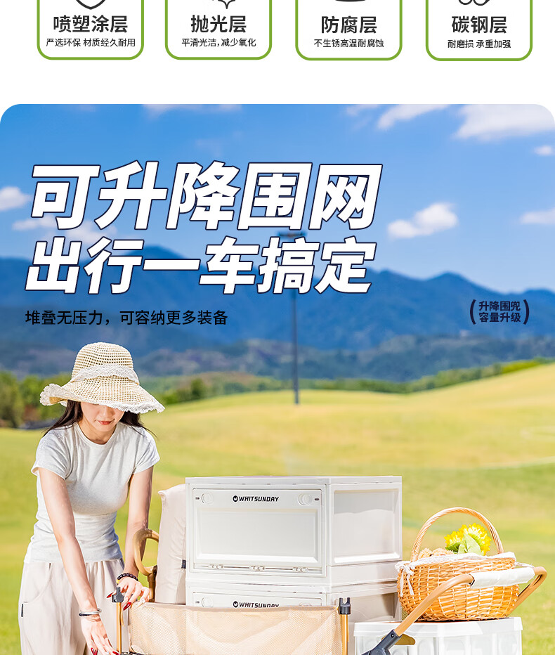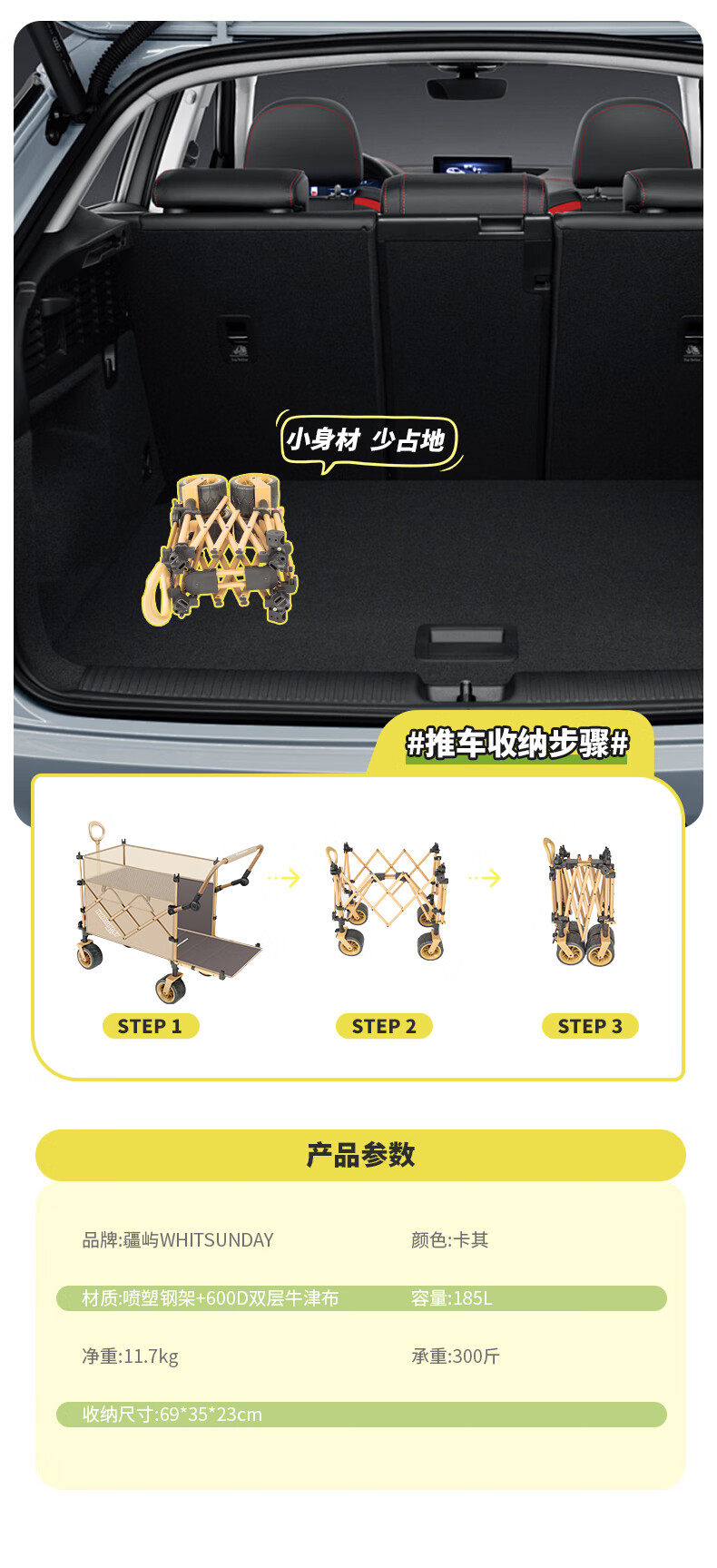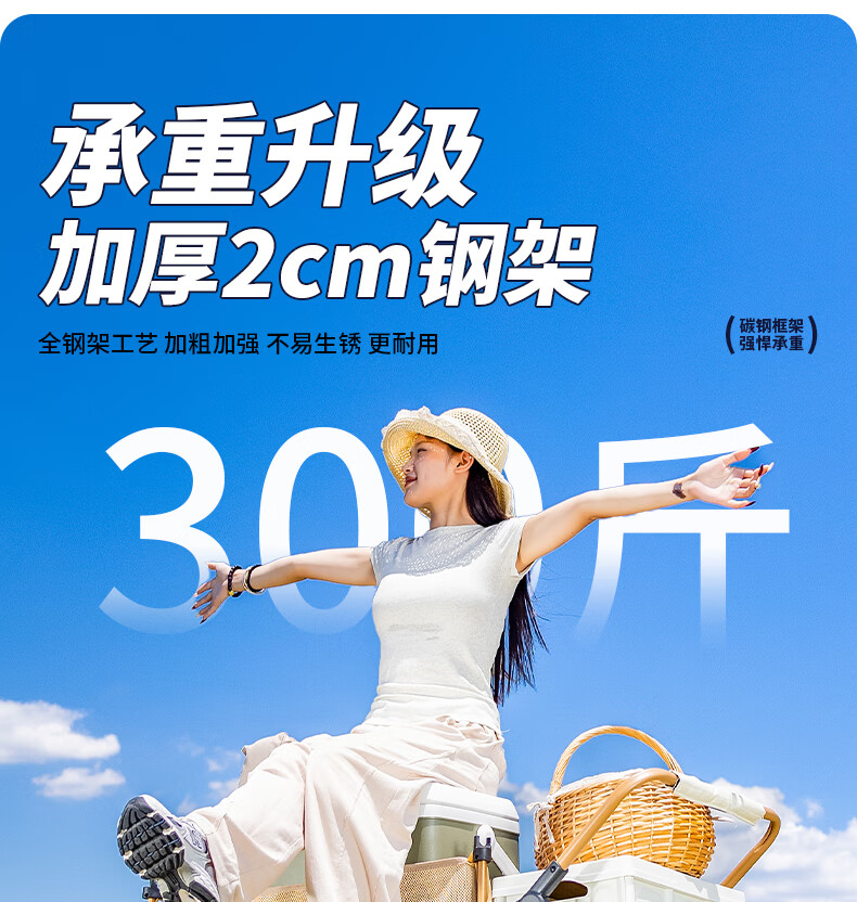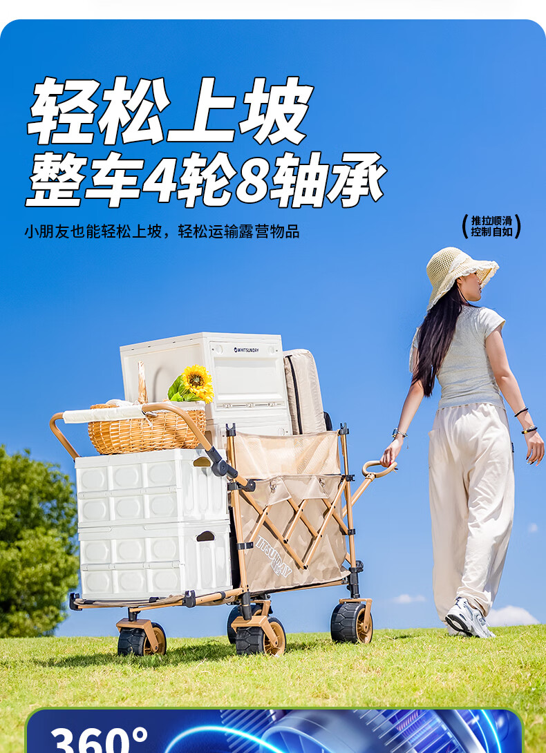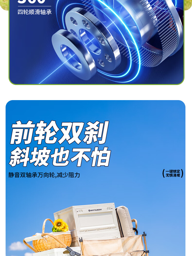 1. 材质与耐用:车架碳钢+抗撕裂牛津布,结实抗造。喷塑工艺防刮防锈,复杂户外环境也耐用,承重强,轻松应对露营装备搬运 。 2. 折叠便携:两向折叠超方便,一提就收拢,不占空间,放车后备箱或家里都轻松,单人/小家庭出游适配。 3. 灵活好推:万向车轮360°转向,崎岖山路、沙滩等地形都能驾驭,手柄可按身高调高度角度,推拉省力,长时间用也不易累。 4. 容量实用:大容量能装,70L车身堆载达140L ,帐篷、睡袋等露营物,日常购物、取快递、搬小物件都能行,一车多用。 5. 细节贴心:手柄人体工学设计,握感好还带固定扣;静音轮胎不扰人;部分款有隐藏遮阳棚,太阳大时能给娃遮阳 。 6. 性价比高:百元价位(日常一百出头 ),功能、质量能打,对露营新手或注重实用的人,是高性价比之选。 像 “车架结实抗造,牛津布耐扯,喷塑防锈,用好久没磨损,装一堆装备稳稳的”“折叠太方便!不占空间,出门放后备箱,露营、买菜、取快递全能干,性价比绝了” 这类真实体验,能让好评更生动~