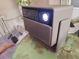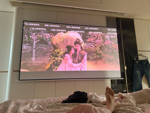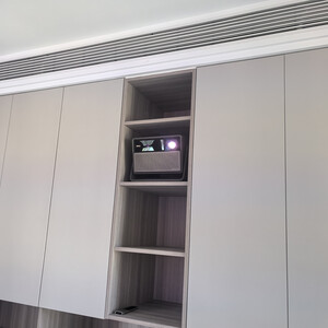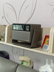 1.放在柜子里,外观不错 2.白天开亮度可以接受,无阳光直射的情况下 3.拍出的照片泛红,实际无泛红情况 4.尽量不要像我这样,放在小空间里面,扇热不太好,亮度太高的话,噪音比较大 5.目前投射的画面差不多145寸,没有配幕布,前期墙面处理的比较平整。