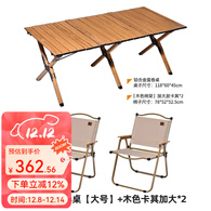 原始人户外折叠桌铝合金蛋卷桌露营桌子野餐桌椅便携式装备野营野炊 大号铝合金桌+木色卡其加高*2
