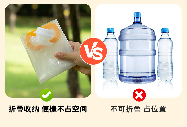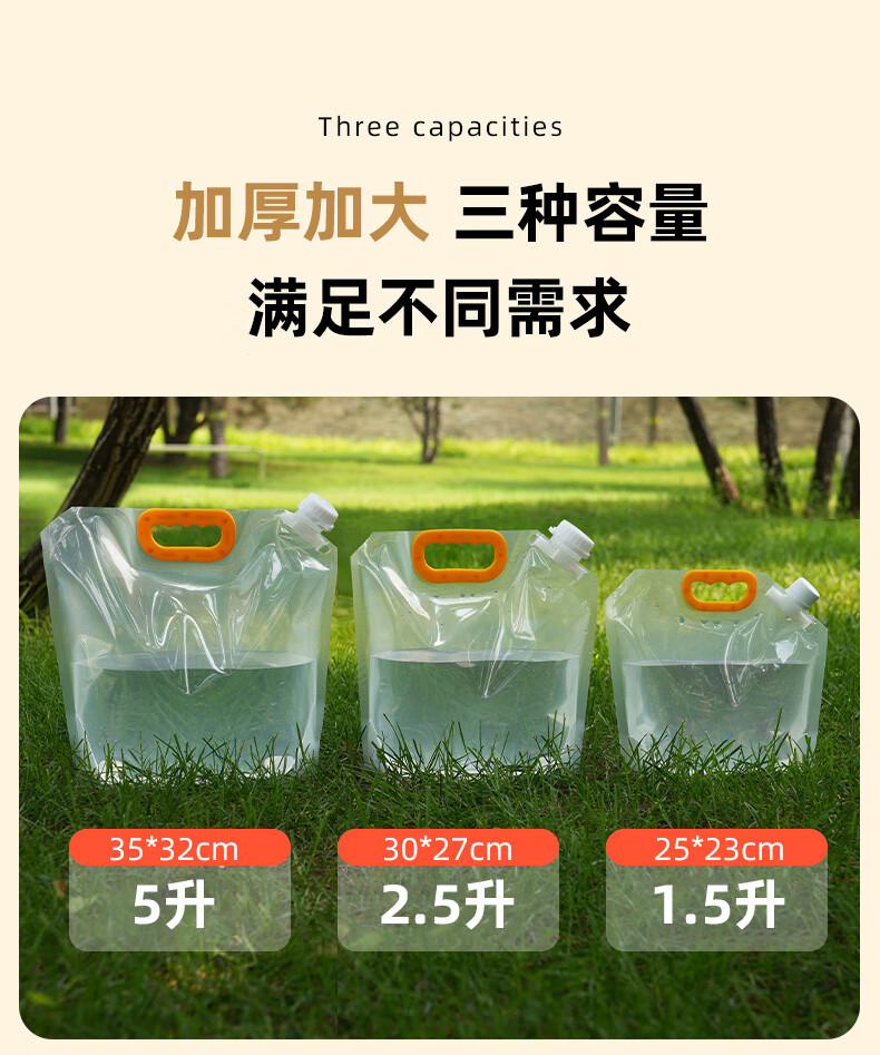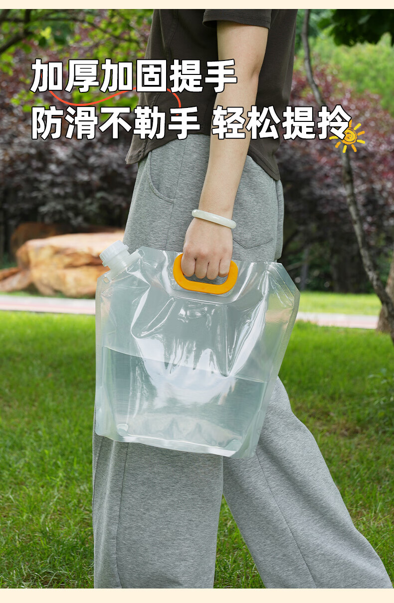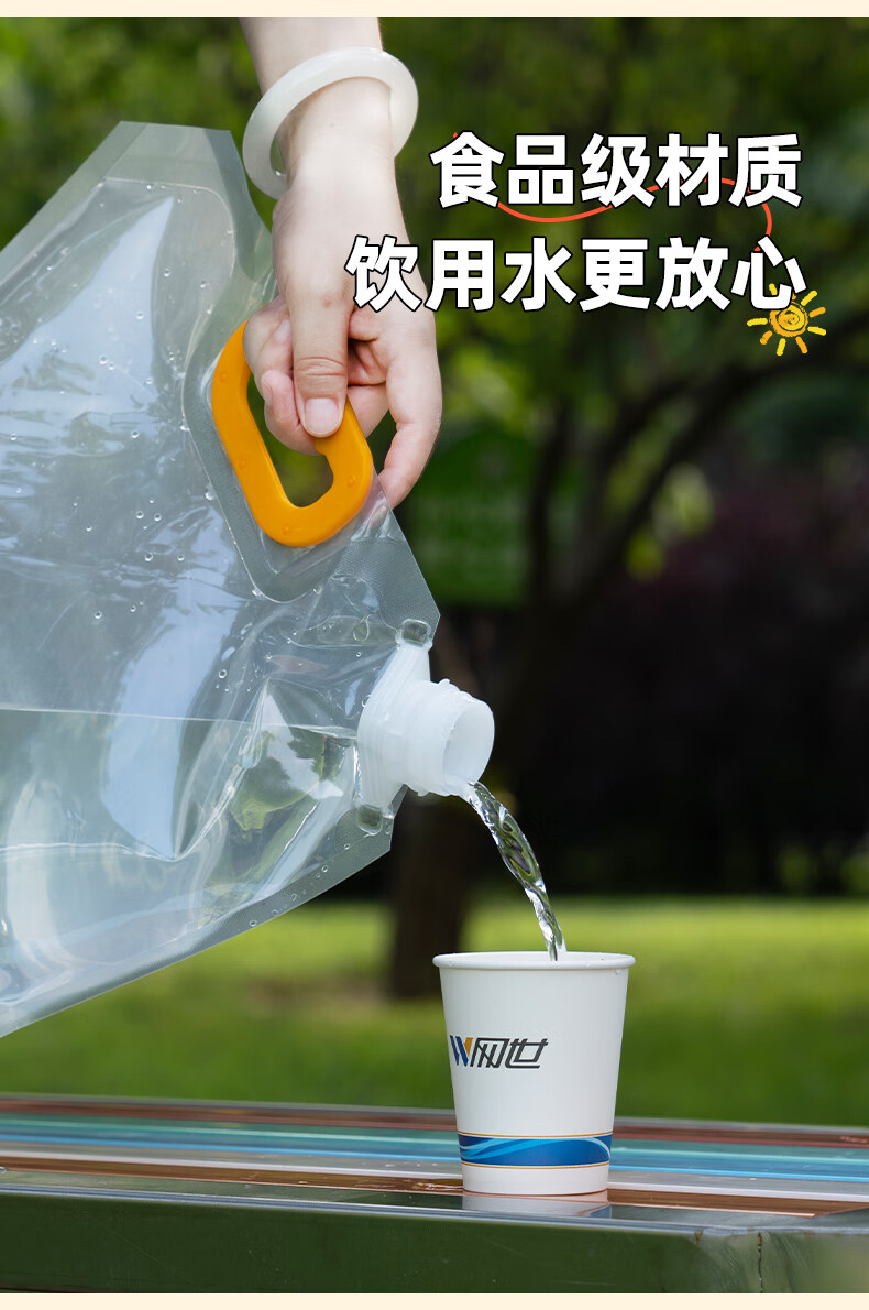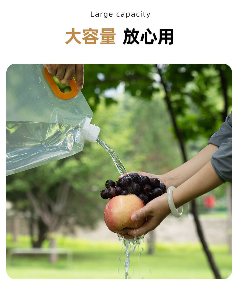 刚收到就带去露营用了,折叠起来超方便,塞包里完全不占地方。装满水拎着也不重,倒水的时候很顺畅,没漏过。价格挺划算的,比想象中耐用,野餐或者徒步带着都很实用,用完一冲就干净。