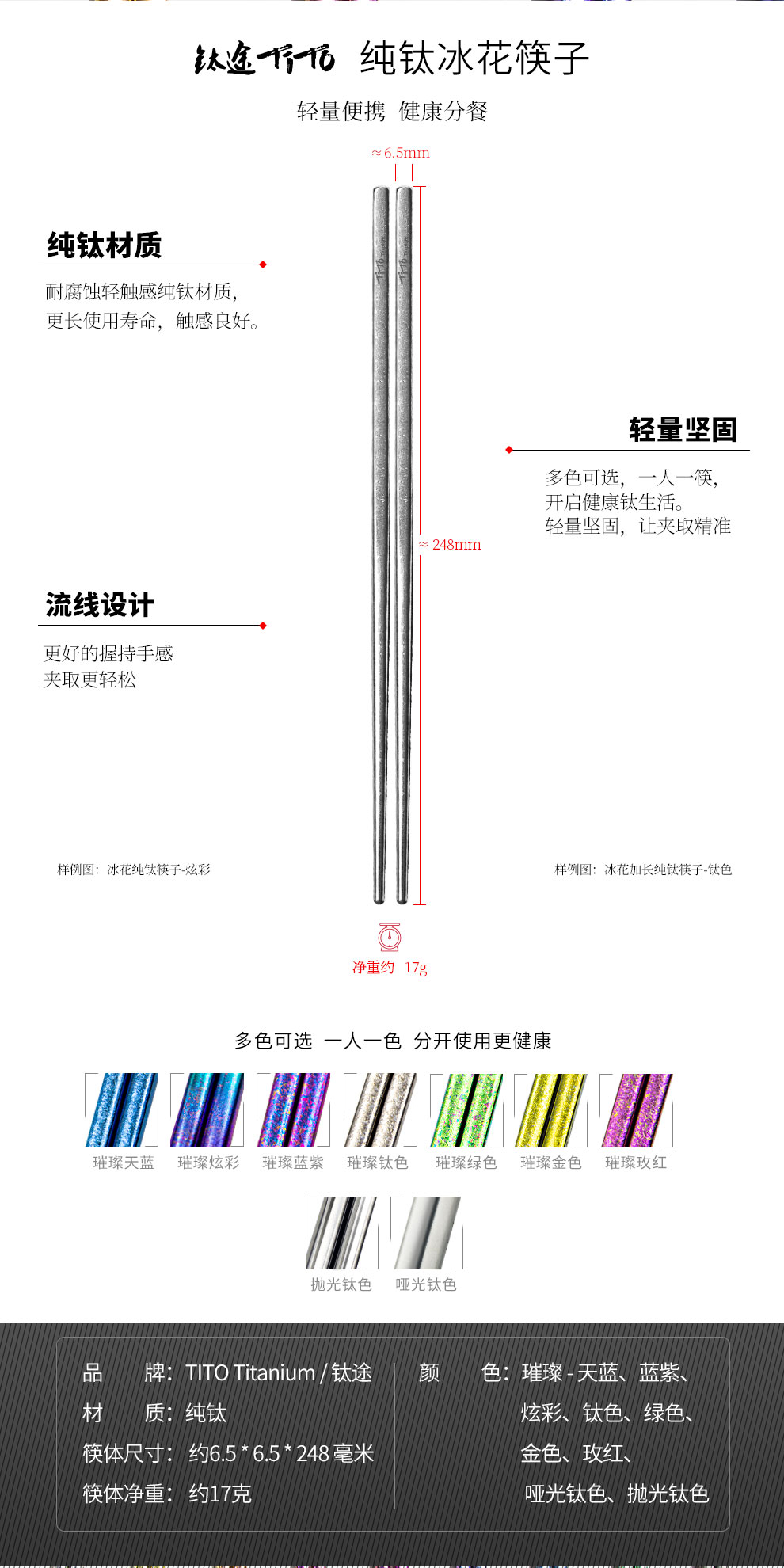 钛途纯钛筷子真的让人眼前一亮!材质轻巧坚固,手感舒适,长时间用餐也不累手。纯钛打造,无涂层不生锈,不滋生细菌,用着特别安心,对健康超级友好。夹菜不打滑,无论是热菜、凉菜还是面条都能轻松驾驭。外观简约高级,自带高级感,自用显品味,送人也体面。耐用性极强,真正是一次投入,长久享用,非常值得入手!