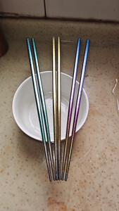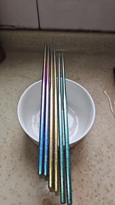 发货快,物流快,包装完好,质量良好。和描述一致,重量轻,硬度高。颜色渐变很漂亮,试过了,导热速度比不锈钢的慢,虽然没有木筷子那么涩,但和不锈钢筷子相比来说,算不滑的了。曾考虑过带有防滑工艺的钛筷,但又担心,加工和纹理过多,反而容易藏污纳垢,不如这种简单原始的设计更安全,整体满意。