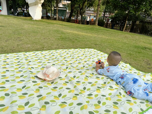 颜色买的比较素雅,显得很干净,⛺不沾草,底面防水设计,😊小孩使用很安心,非常好的野餐垫~