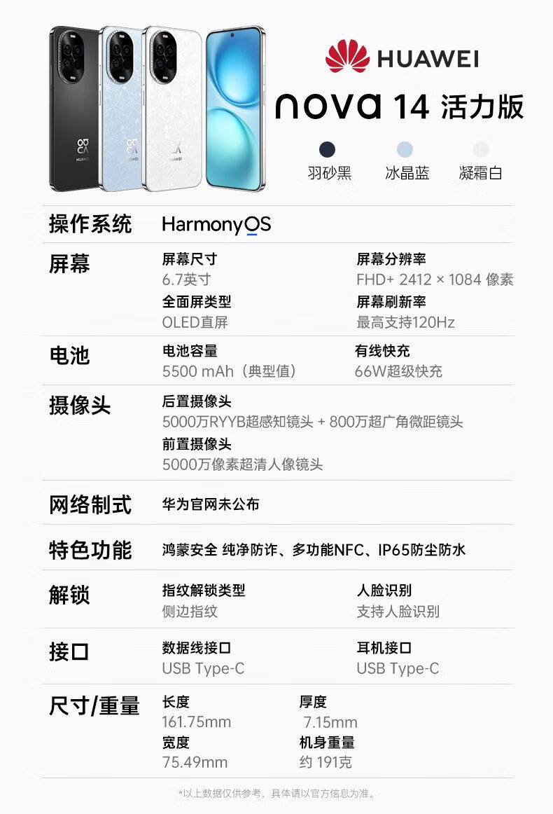 华为现货当天发 华为ova14活力版华为手机 512G鸿蒙智慧通信66W快充护眼直屏高清5000万像素自拍鸿蒙AI 凝霜白 12GB+512GB