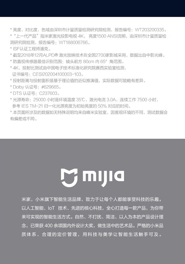 小米(MI)激光家庭影院2 4K超高清100英寸2400ANSI流明杜比全景声ALPD 32点梯形校正超短焦激光投影巨幕电视 激光影院2 4K【短焦近投 4K超清】