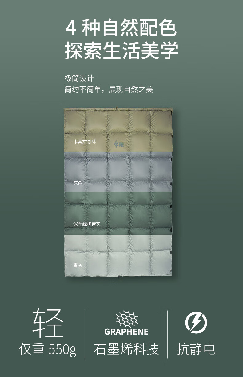 选了好一阵子的露营鹅绒被,终于入手这款,整体做工还不错,基本没有味道,厚薄适中,适合春秋季节使用,方便收纳,轻巧实用,在家也可当午休盖被。