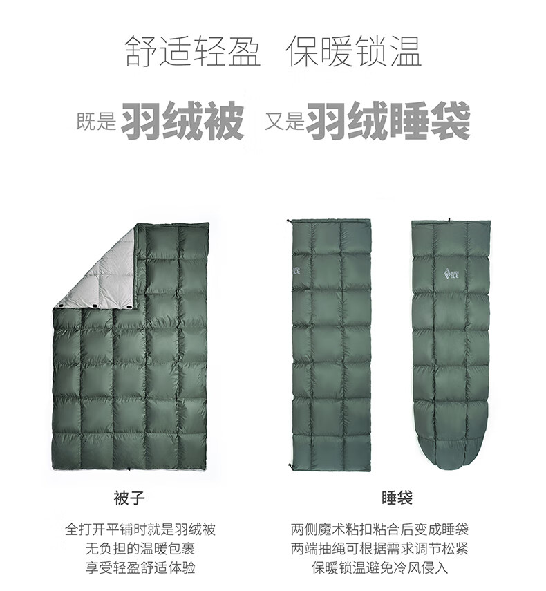 很薄像是夏凉被似的。540的价格还是不值的。绒朵可见应该比Z系列睡袋的差一点。防伪码不是绑被子上的,是绑袋子上的。变不了睡袋,谁家睡袋魔术贴,会漏风冻死的。出厂就是压缩状态的,需要放大袋子里恢复一下。