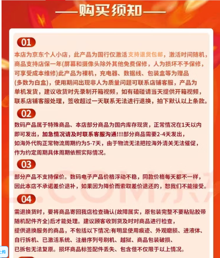 支持7天无理由退货【激I活机型具体信息咨询客服】客服告知为准默认下单则默认店铺商品保修情况