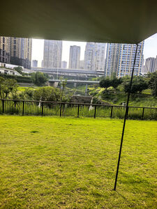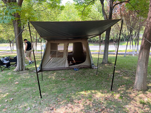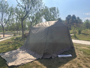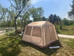 非常好的购物体验,早就想升级一下户外装备,看了好长时间,双11前终于决定下手。看着好像结构挺复杂,但实际上非常好搭建,两个人互相配合,快搭快拆,非常方便。效果很好,秋日里一道靓丽的风景。不过,想要实现网上所展示的全开效果,还得另外再购买两套天幕杆才能实现哦