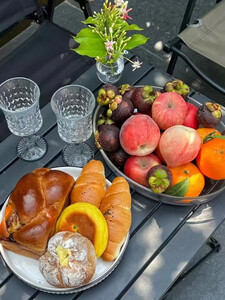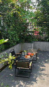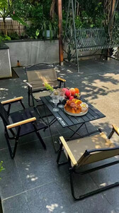 桌子搭着克米特非常好看,非常搭我的院子,看着就很有高级感,尺寸也合适,坐3-4人没什么问题,桌腿也挺稳固的,上面放着东西不会晃。