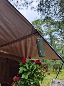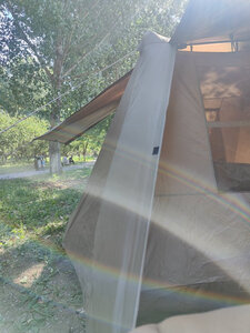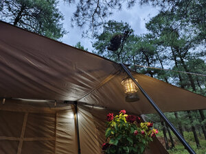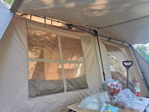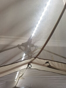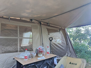 第一次用这样大的帐篷,看着眼前的一大包有些茫然,好在稍有些经验就能应付过来,支好后需要不断的适应调整这些绳结和支杆满足需要。 总结起来,觉得正面的透气窗口应该开口和窗口一样大,不像图片里有四分之一无法开到底。 拉索的品质不错,很顺滑。自带的灯带由于没有准备电源没有感觉。 需要提醒大家的是,收起帐篷时千万小心雨伞骨架型的支架,夹到手指会很痛而且不容易取出。