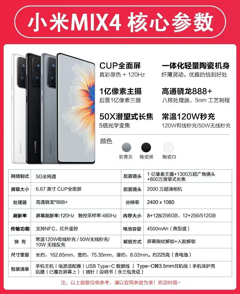 MIUI小米 Xiaomi MIX 4全陶瓷5G手机全面屏骁龙888+游戏 陶瓷黑 12+512GB