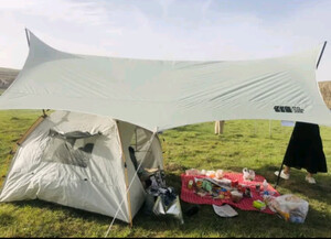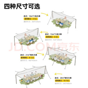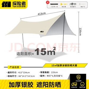 探险者天幕帐篷户外露营超大防晒防风防水银胶遮阳棚穹顶沙滩天幕野餐 28㎡淡黄银胶天幕(10-16人)收到了,携带方便,配件齐全,天幕做工精细,用料讲究,里面是银色的材料,过几天出去的时候看一看有多大,值得推荐