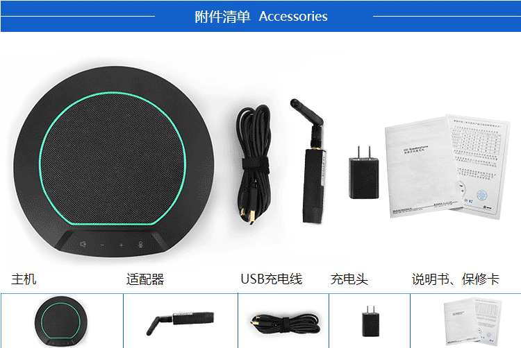 全向麦主机、无线适配器、USB充电线、USB充电头、说明书、保修卡