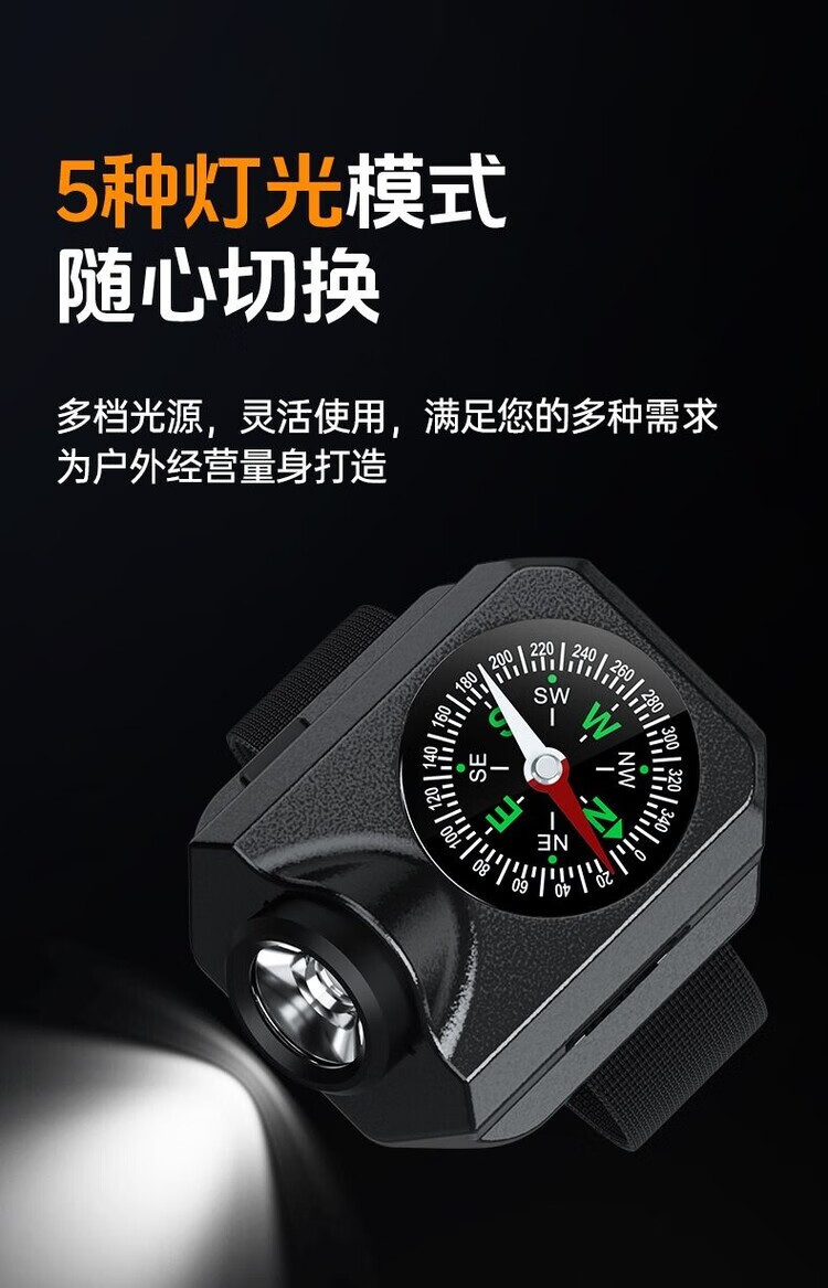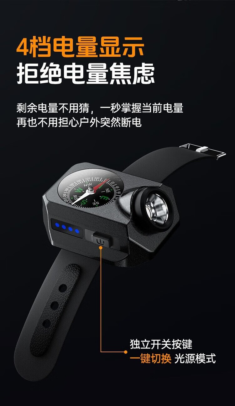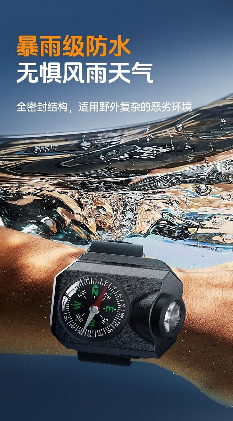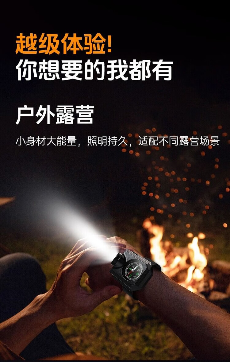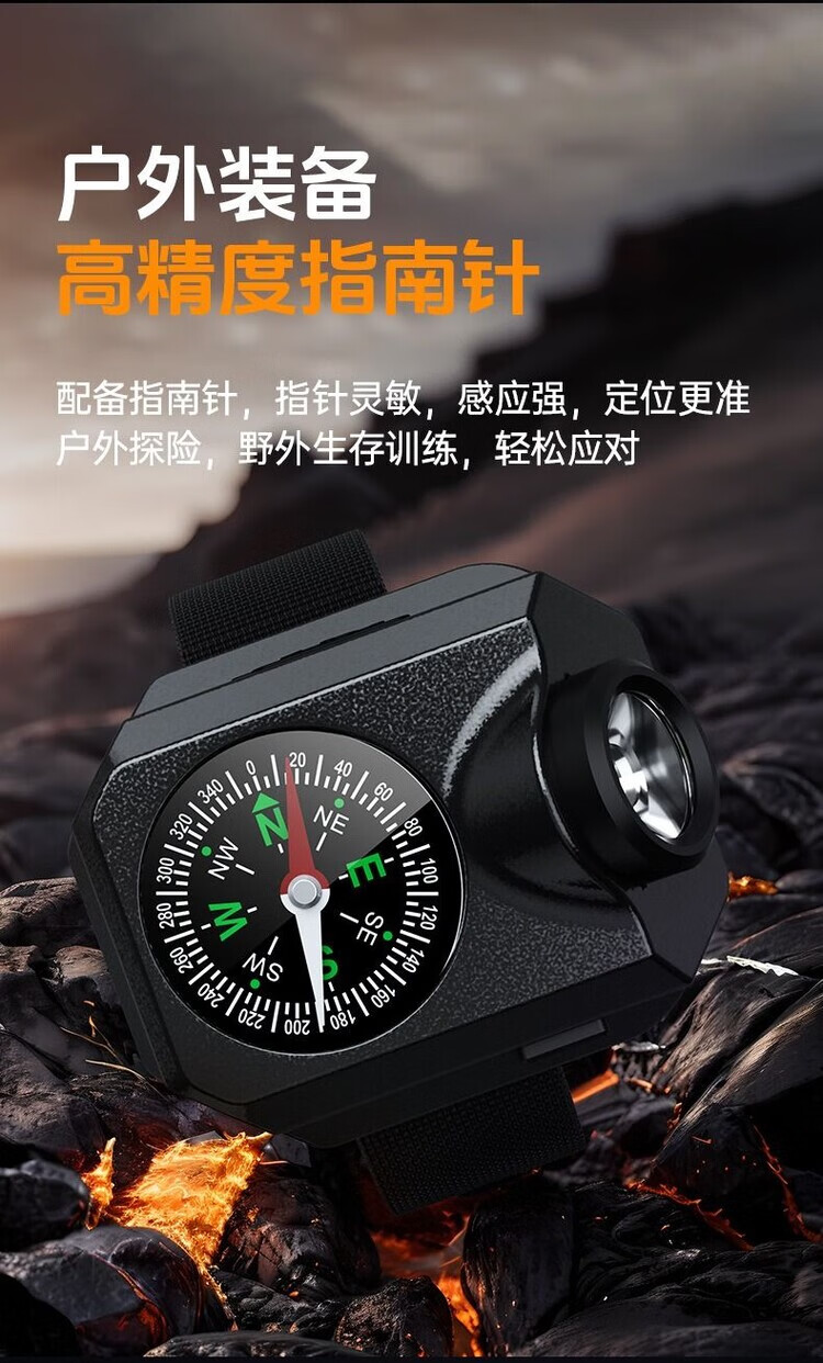 哲初指南针高精度 抗强磁 防水 夜光战术手表电筒白激光温度计伞绳 普通款手腕灯【黑色】