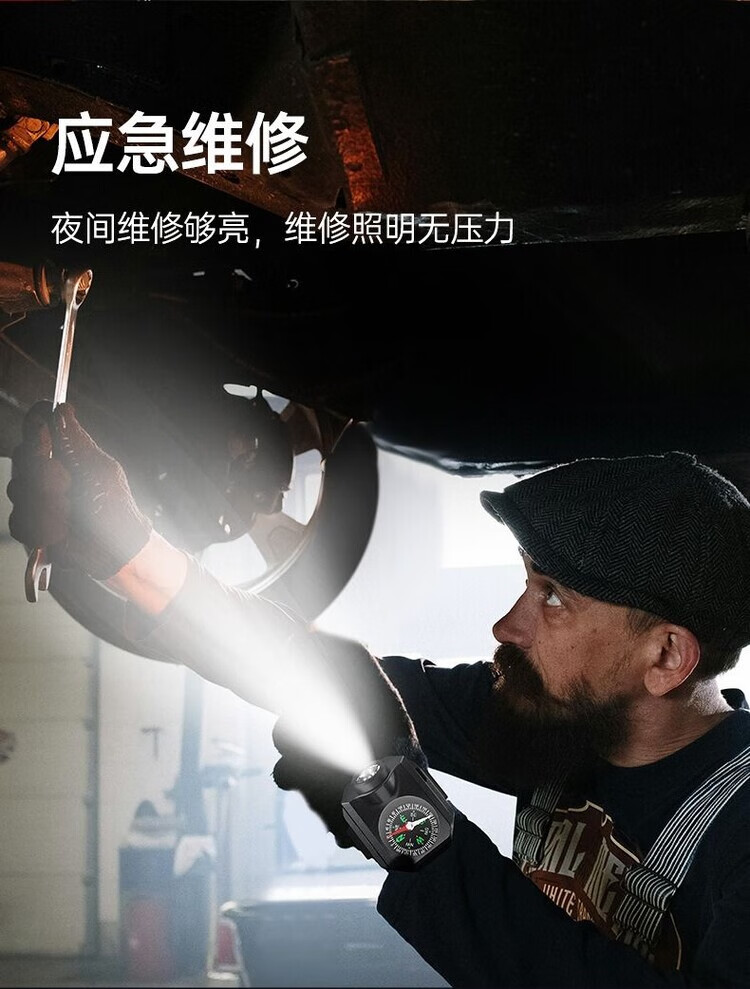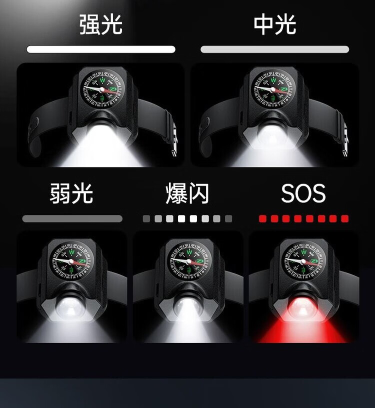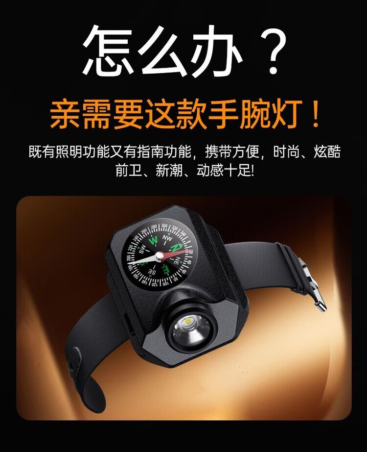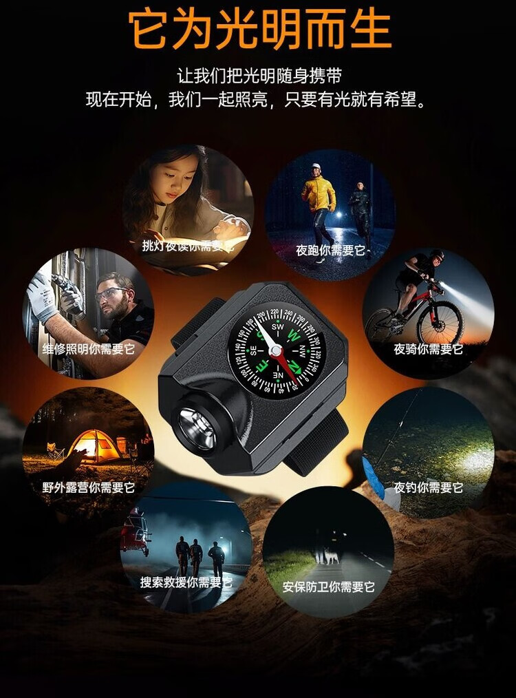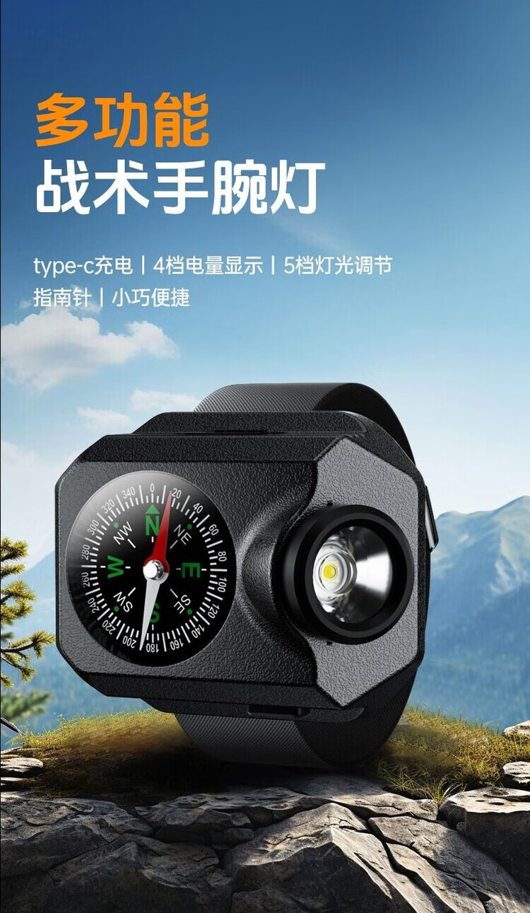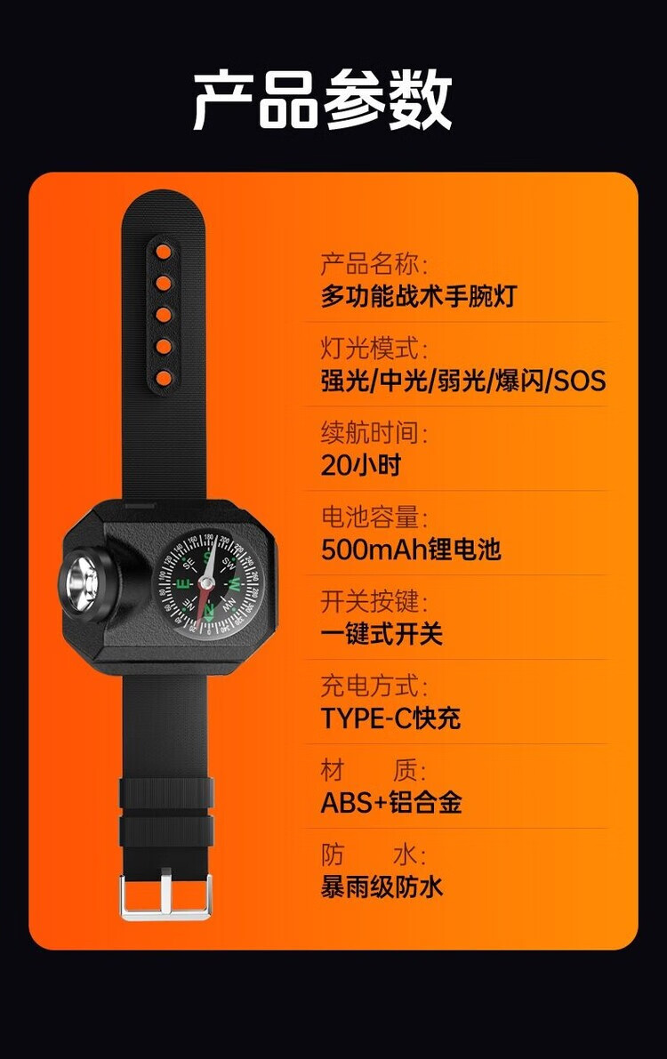 哲初指南针高精度 抗强磁 防水 夜光战术手表电筒白激光温度计伞绳 普通款手腕灯【黑色】