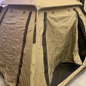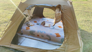帐篷尺寸很大,三个人完全没问题,隔热效果不错,撑开也很简单,按照方向一撑就开,收起来也很方便,天幕是拉链连接到帐篷的,场地小没地方撑天幕,得很大的空地才行,里面自带防潮垫,很不错