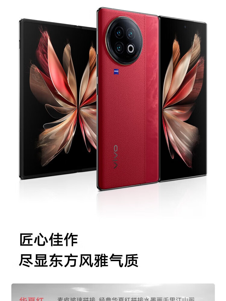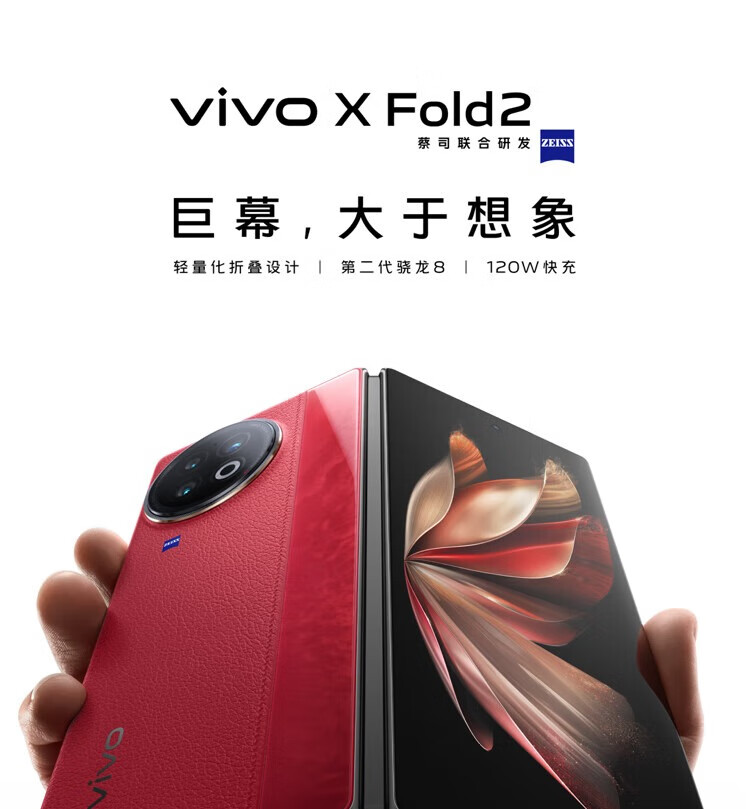 vivoX Fold2 5G折叠屏手机第三代骁龙8Gen3 巨幕屏 悬停蔡司影像 华夏红 12GB+256GB