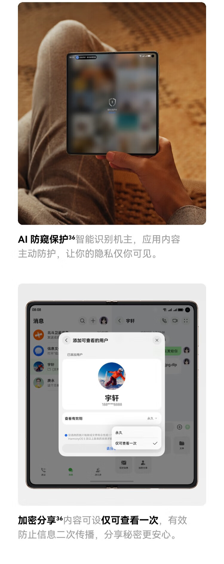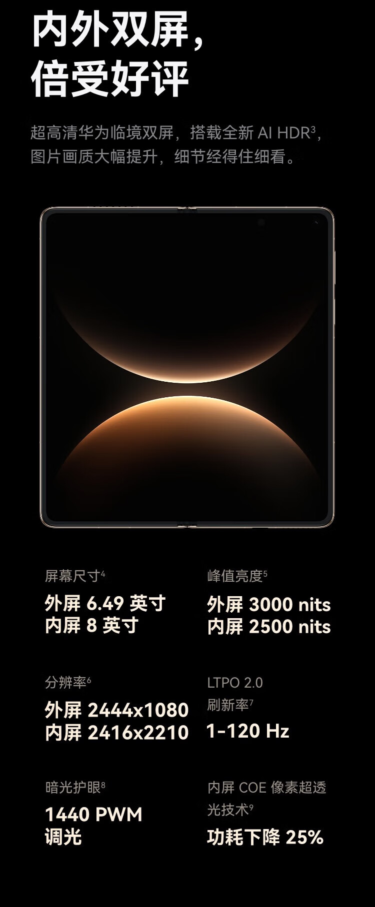 AI大模型,折叠屏,卫星通话,轻薄,LTPO屏幕,高频PWM调光,全焦段影像,潜望式长焦,防水防尘,无线充电,NFC,红外遥控,大底主摄
