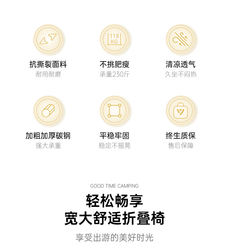 到手产品与宣传相符。椅子做工优良,收纳后不占空间。虽然是碳钢材质的,其实比铝合金的也重不了多少,重量蛮轻的,携带较方便。靠背椅的舒适度比马扎凳强太多,关键价格还便宜,性价比突出。