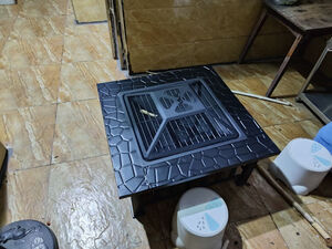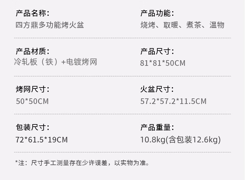 总评:室内用一定要保持通风。买来取暖用的,烧碳比较暖和,装碳的容量刚好,10平方空间取暖够用。炉子不重,一个人可以抬起。烧烤网很硬,放东西在上面不会塌下去。外形美观,不用的时候加个盖子可当小茶几用。小号的边沿约3厘米,放不下东西。炉体及把手都很烫,注意防烫。内胆底部有个小孔,碳灰会从孔部漏一点点到地上。外壳比较脆,不能碰撞,否则会破裂掉瓷。运输中外观受损,商家有担当,赞。安全预警:我室内用,轻微煤气中毒,无碍,一定要通风,要经常拨动炭块,保持充分燃烧。