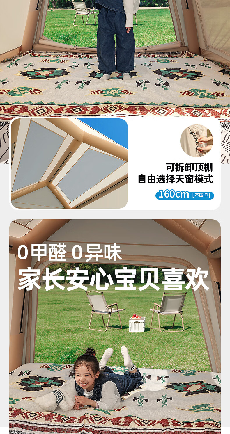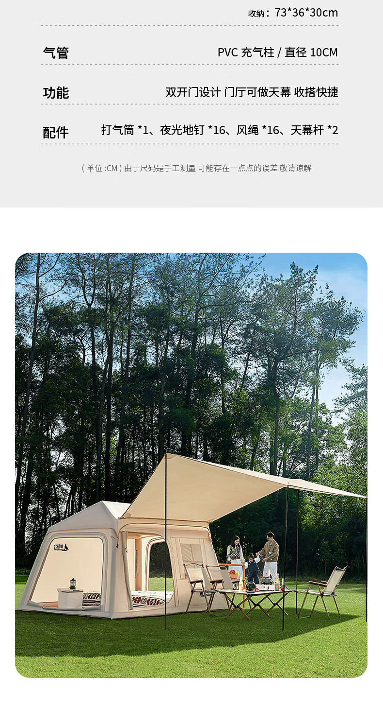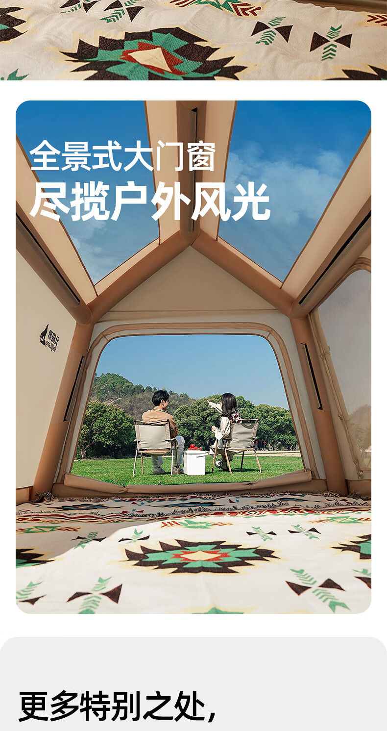充气的超级方便、一分多钟就打满了、帐篷可以在里面站直了、特别宽敞、比我之前买的骨架的好看板正多了、而且是封闭的、都有拉锁、正面还有门、四面都是窗户、天幕也够大、就连送的野餐垫也够大、质量特别好、