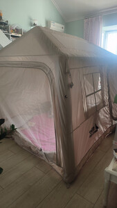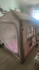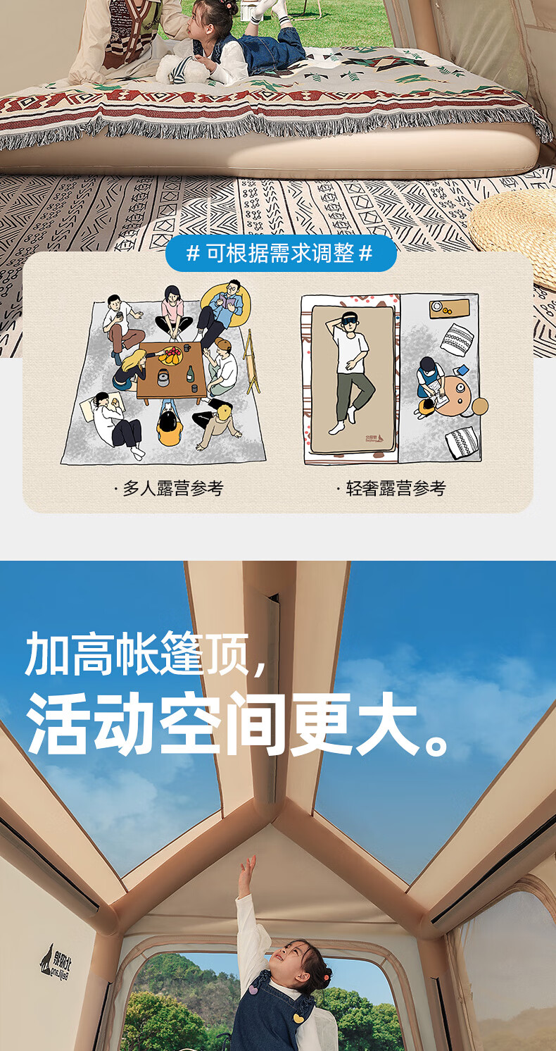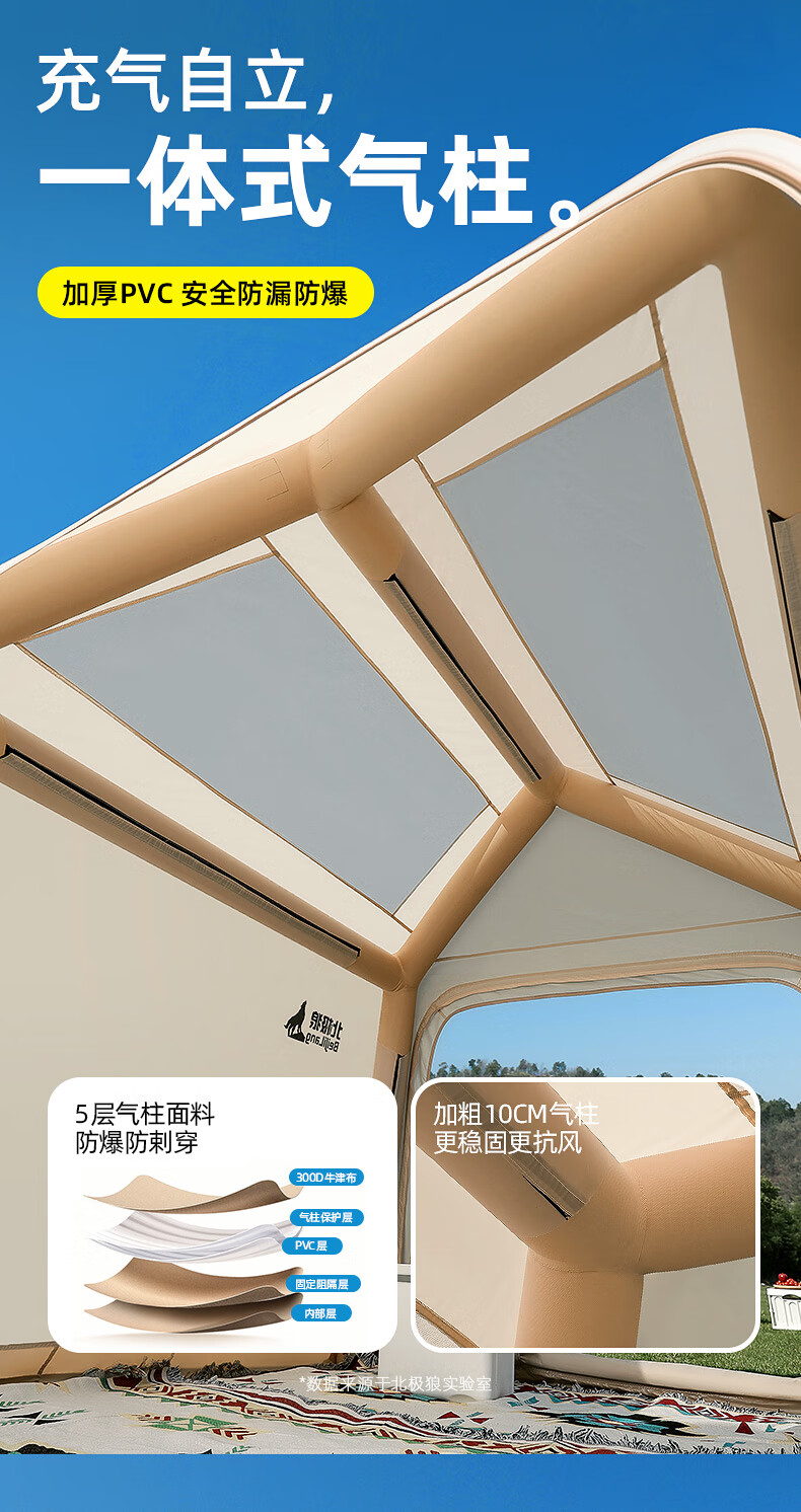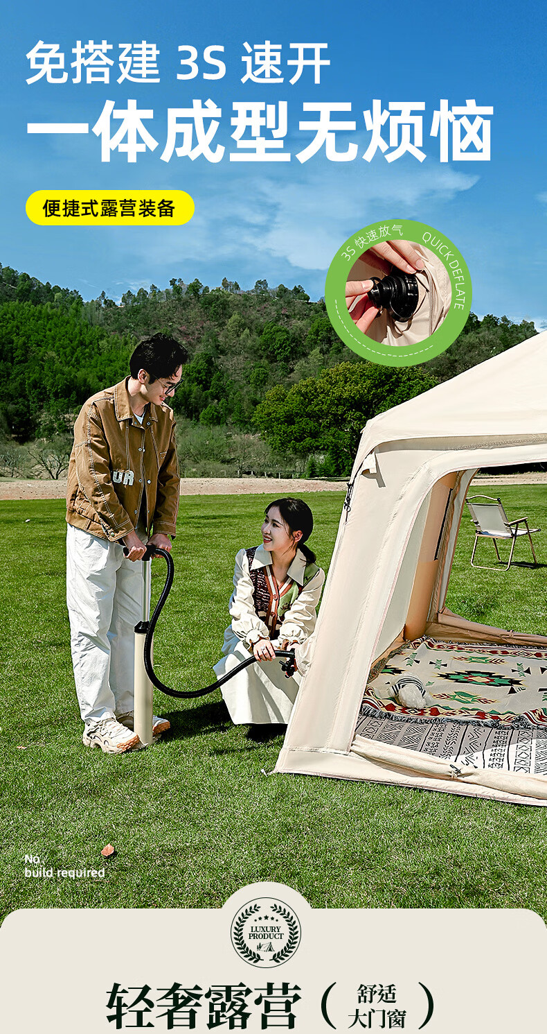 充气的超级方便、一分多钟就打满了、帐篷可以在里面站直了、特别宽敞、比我之前买的骨架的好看板正多了、而且是封闭的、都有拉锁、正面还有门、四面都是窗户、天幕也够大、就连送的野餐垫也够大、质量特别好、
