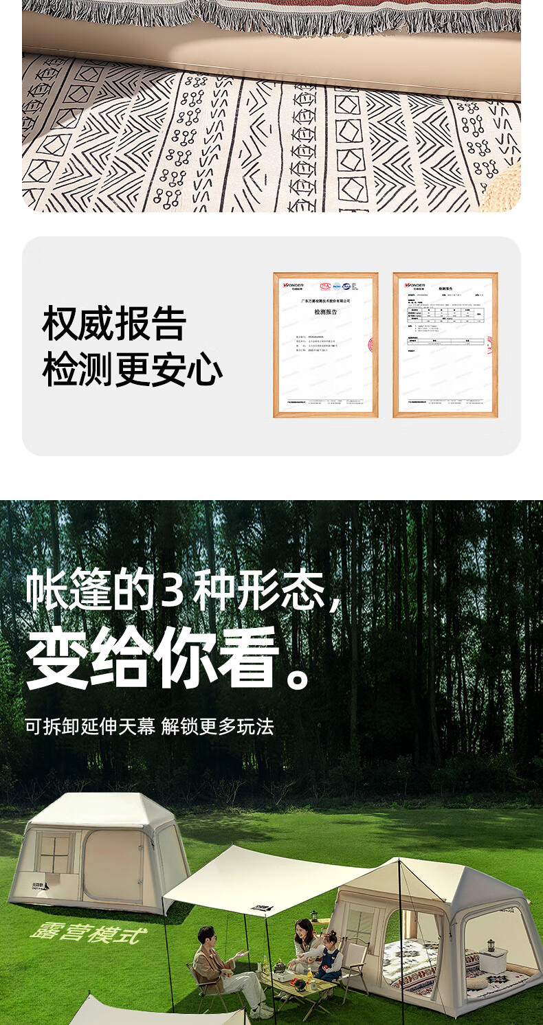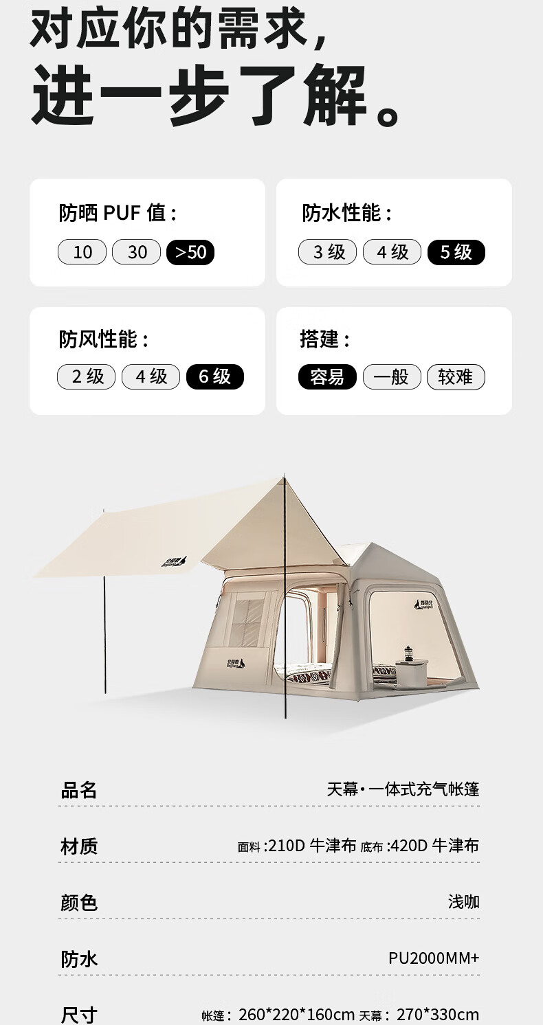 产品功能:非常好,轻轻松松的就能充气完成 外观材质:帐篷整体材质真不错!非常满意 商品品质:<我是特地选择牛津布防水帐篷的,牛津布防水 露营帐篷最适合用了