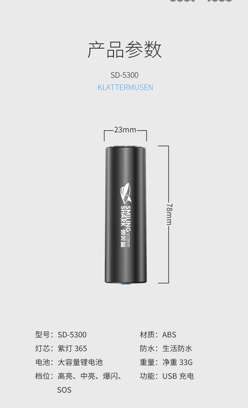微笑鲨的紫光灯,不错很好,快递包装严实,是鉴定的手电筒,蔬菜检测蓝帆,蓝光荧光剂365nm紫外线农药检测灯,100毫安的紫光检测, 蔬菜农药残留检测灯,发货速度快。 产品材质:很好 光照强度:不错 续航时间:可以 产品重量:可以