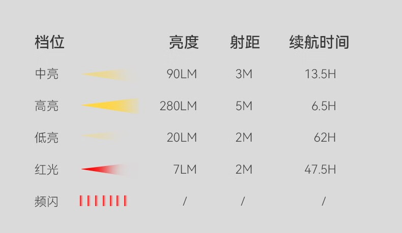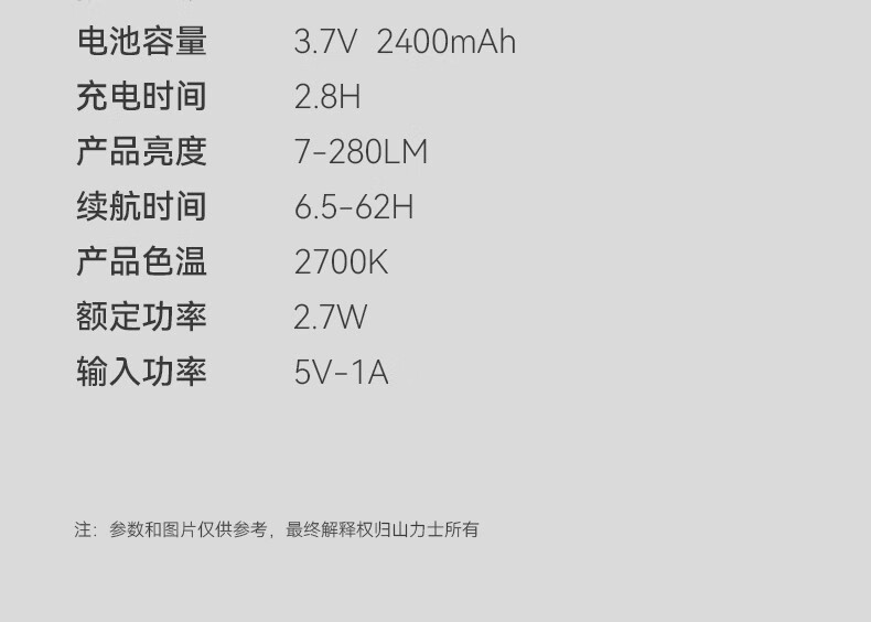 产品材质:手感很哇塞,很有质感(•̀ᴗ•́)و̑̑ 光照强度:几种亮度可供选择,适用不同场景 续航时间:还有待测试 产品重量:很有分量 其他特色:刚好刮大风赶上小区停电了,立马拿出来用了一下,很实用,小朋友也很喜欢一直拿着玩