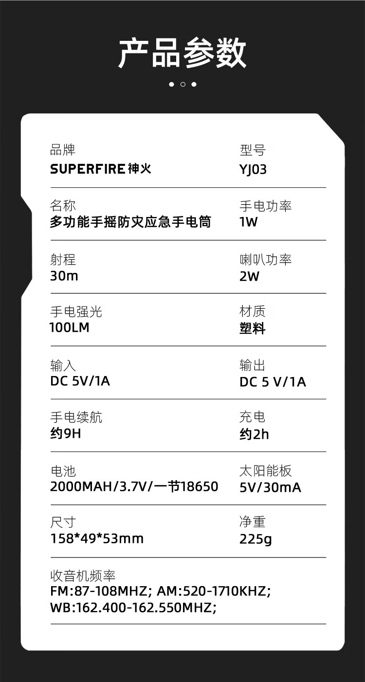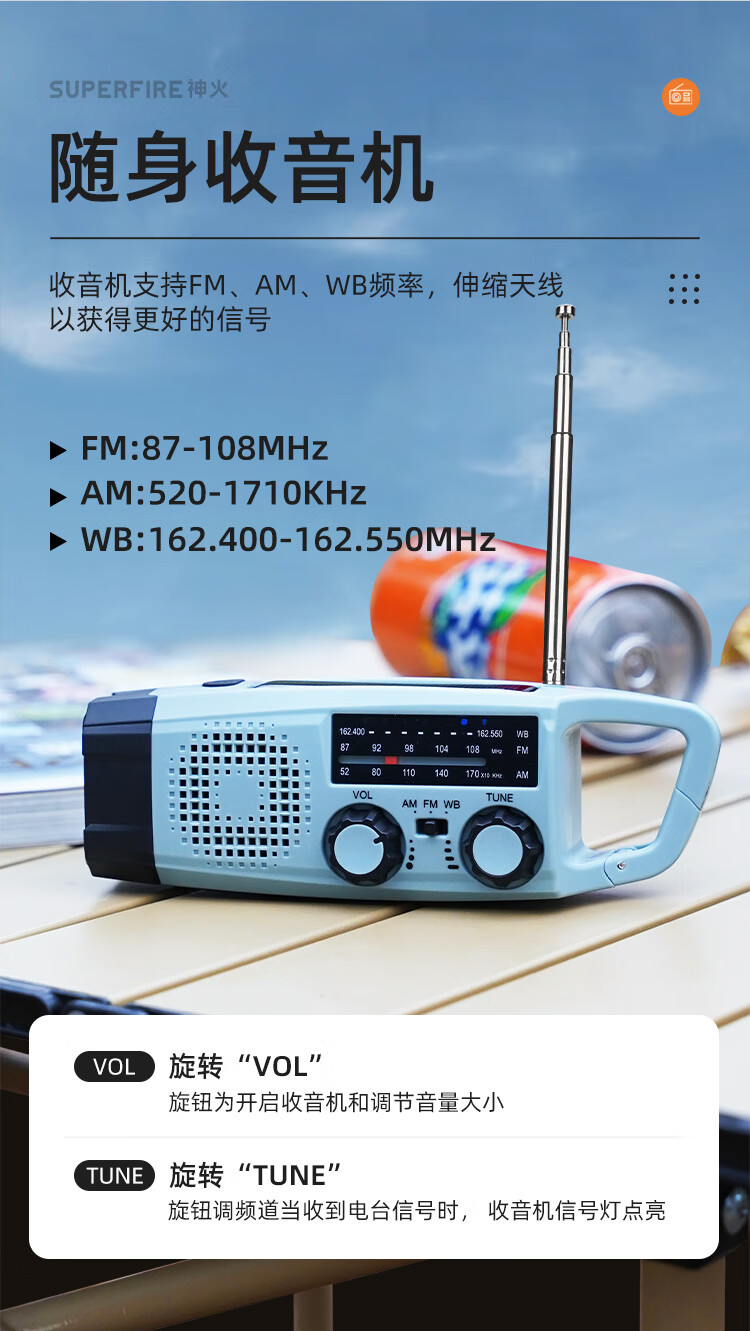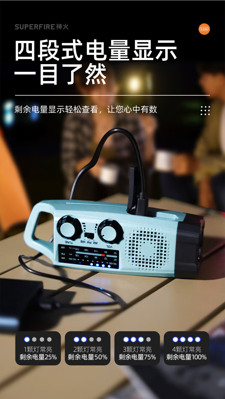 这款手电功能太强大了,可以普通充电还可以太阳能充电手摇充电,充电后还可以放电做充电宝,有收音机功能,收到电台蛮多的声音也很清晰,真是一个宝藏手电,手电报警功能把我吓一跳,不错值得推荐