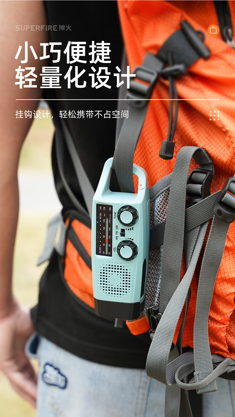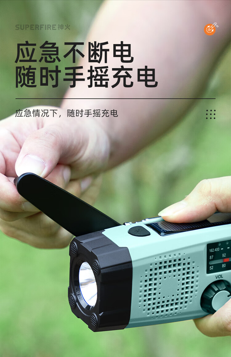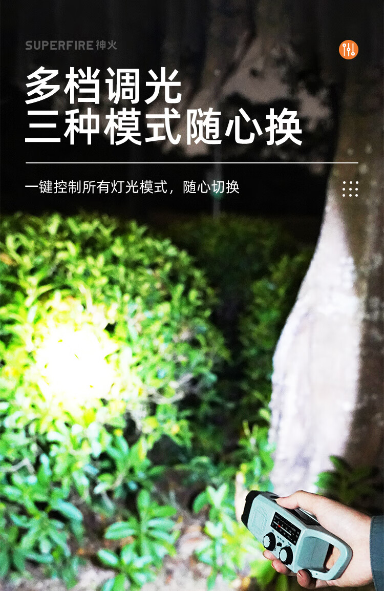 这款神火应急手电筒功能全面,可以C口充电又可手摇与太阳能双发电保障,野外断电都不慌。收音清晰,照明持久,做工扎实,体积也便携。是家庭应急、户外探险的可靠帮手,安全感十足,值得入手!