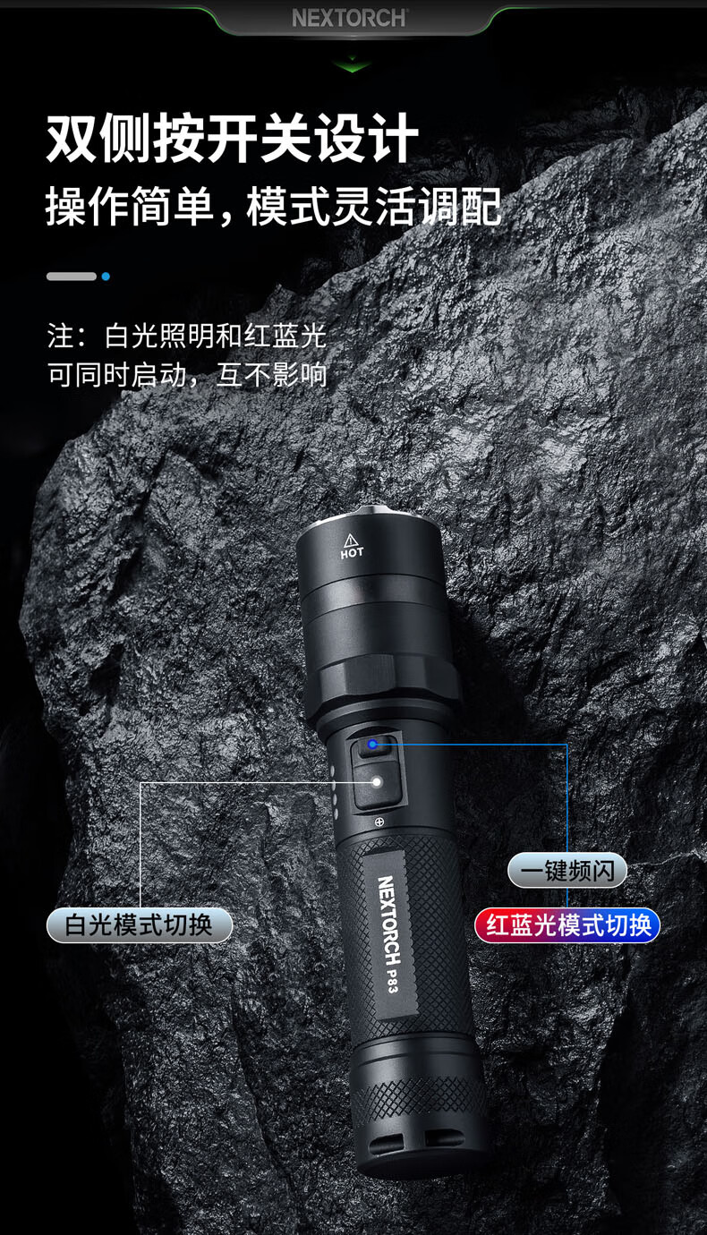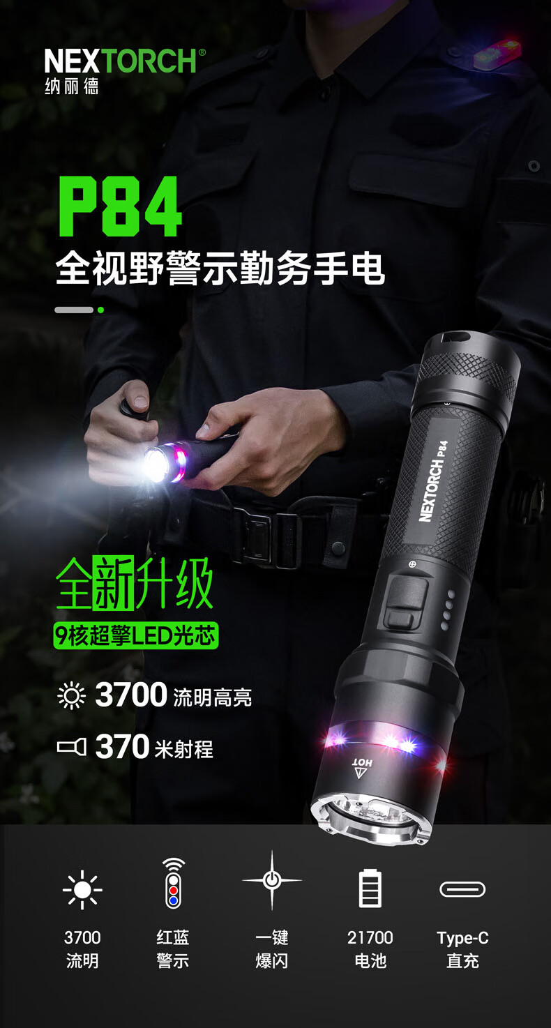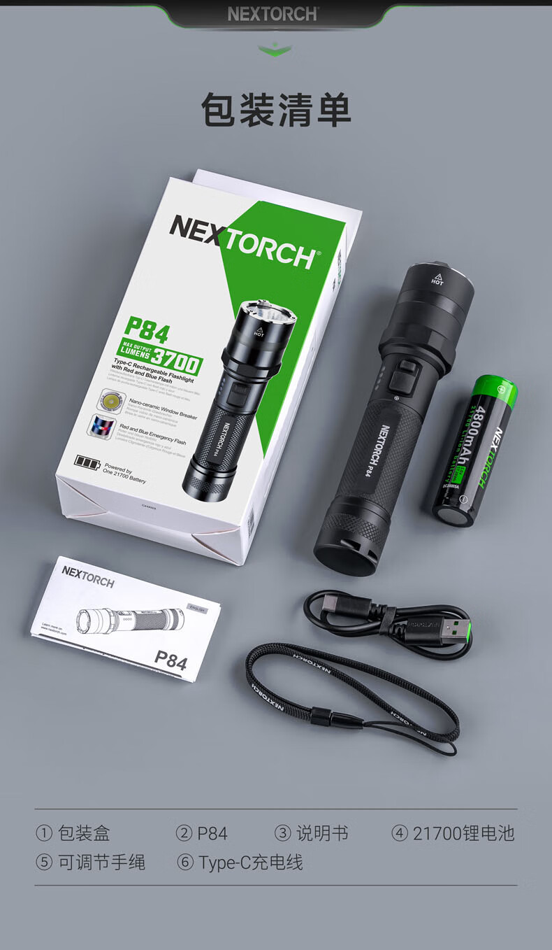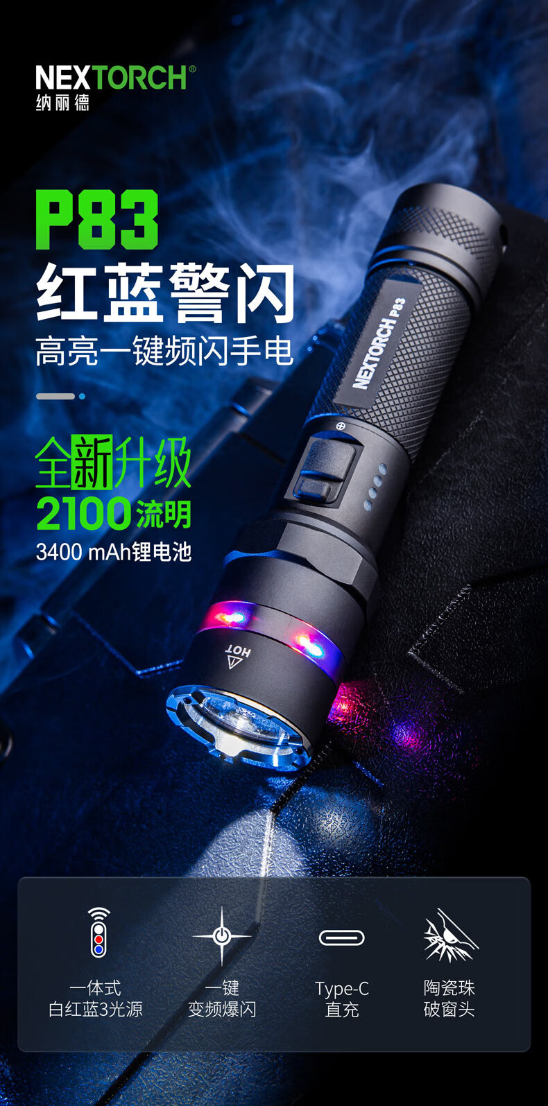 纳丽德P83/P84强光手电筒红蓝闪多功能防灾应急破窗自救逃生一键爆闪 P83标配(2100流明)赠套+油+罩