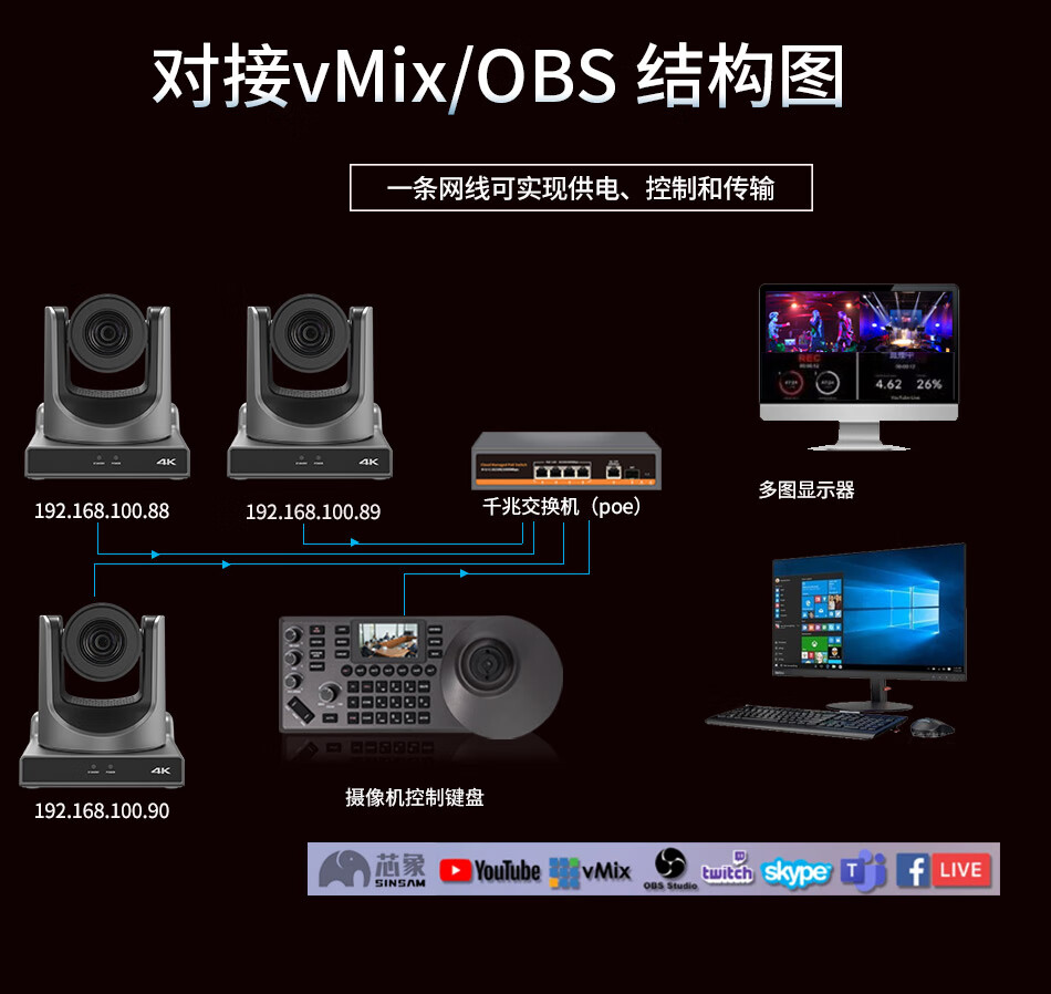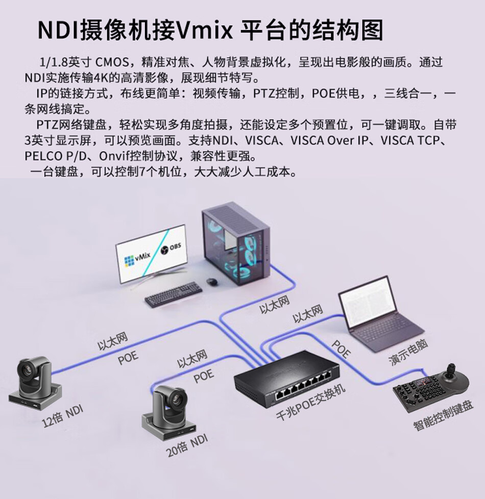 华平云讯4K NDI PTZ Camera会议摄像机云台AI跟踪文化传媒舞台教堂教学直播酒吧导播摄像头支持OBS/VMIX 4K60帧 20倍NDI(两台)+NDI控制键盘